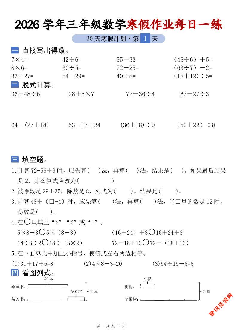 聚码网 三年级 26学年三年级数学上寒假作业每日一练30天复习预习(含答案60页) http://www.appstore168.com/118656.html