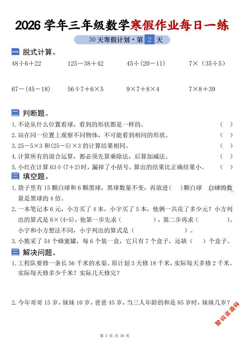 - 三下数学寒假作业每日口算30天 2026-02-17