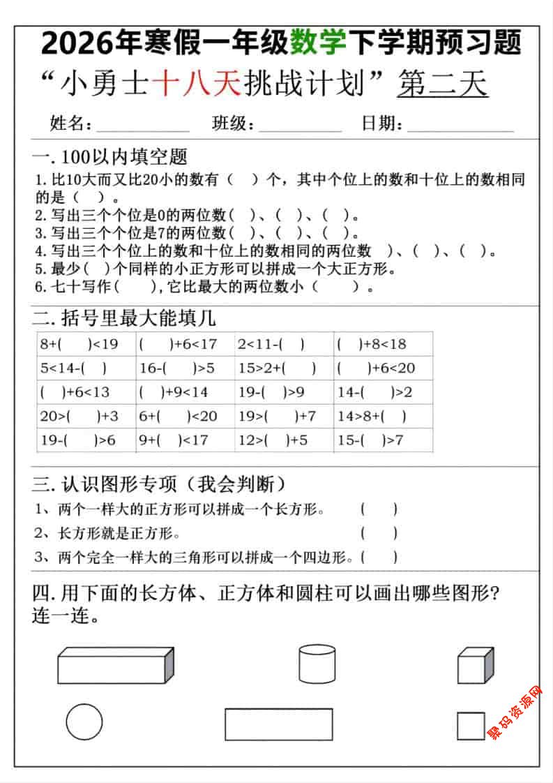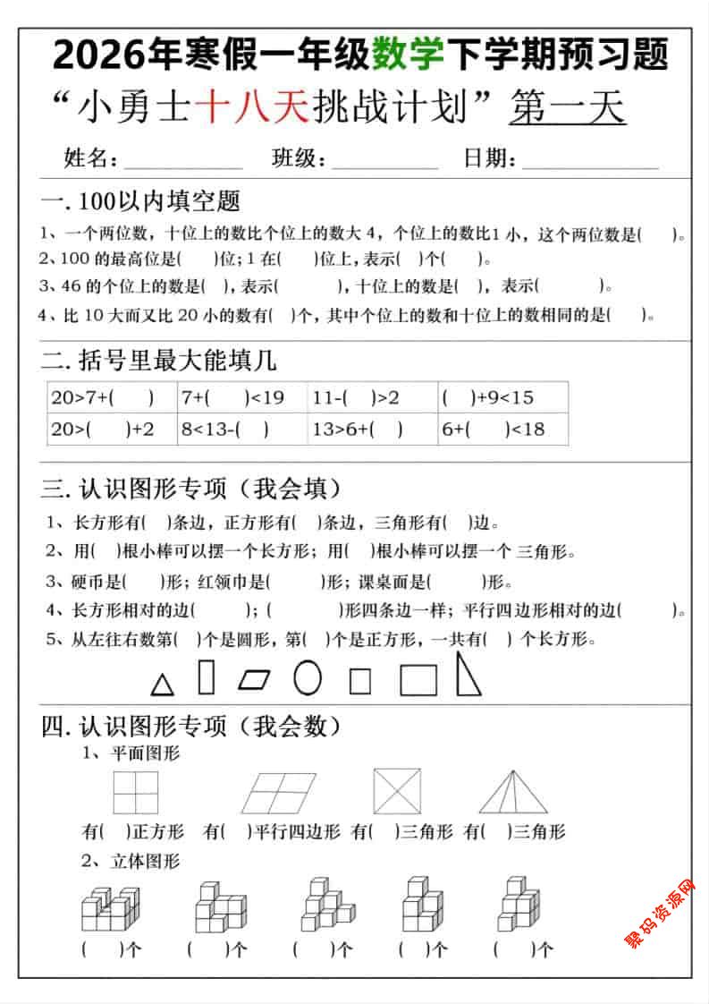 聚码网 一年级 26年一年级寒假数学下学期预习题18天挑战计划(含答案36页) http://www.appstore168.com/119180.html