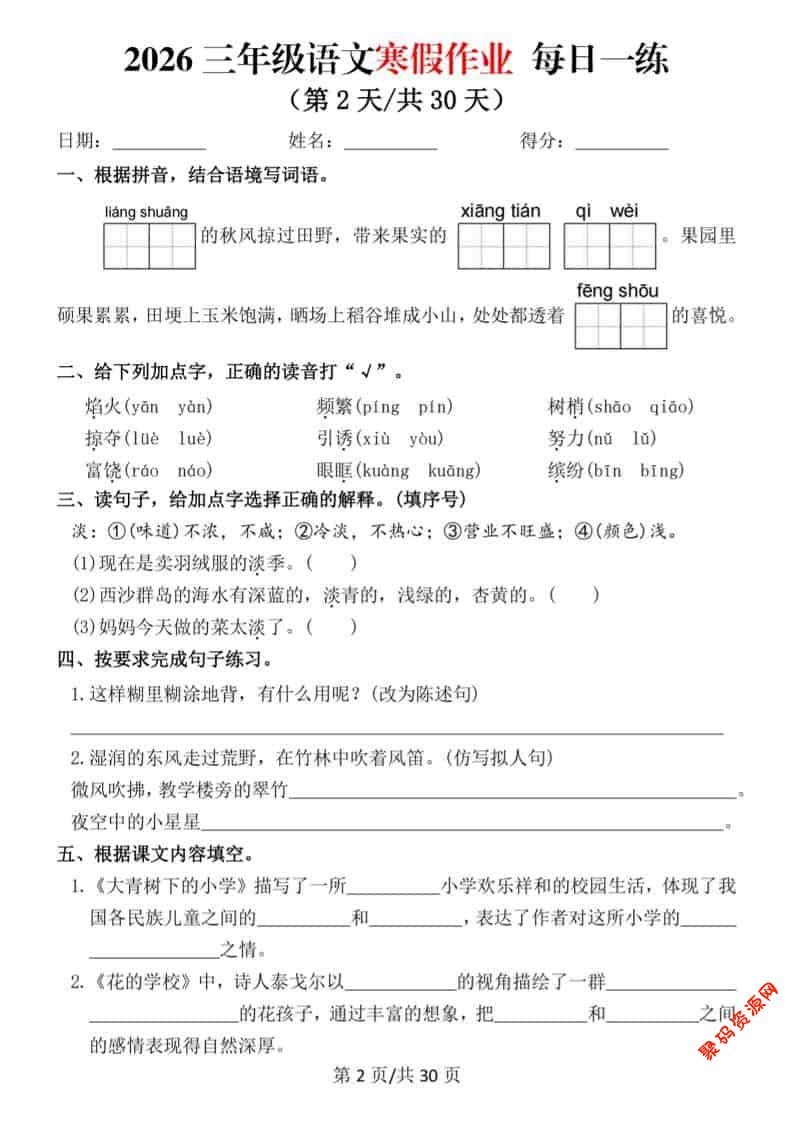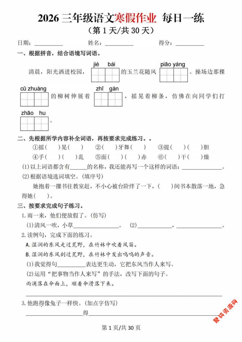 聚码网 三年级 2026三年级上语文寒假作业每日一练 http://www.appstore168.com/119185.html