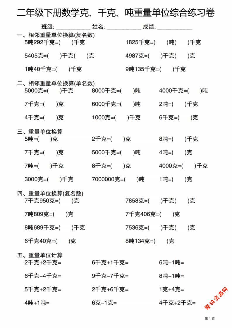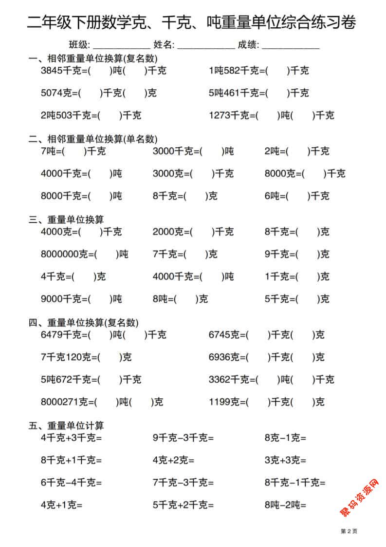 聚码网 二年级 二年级下数学克千克吨重量单位综合练习卷 http://www.appstore168.com/119263.html