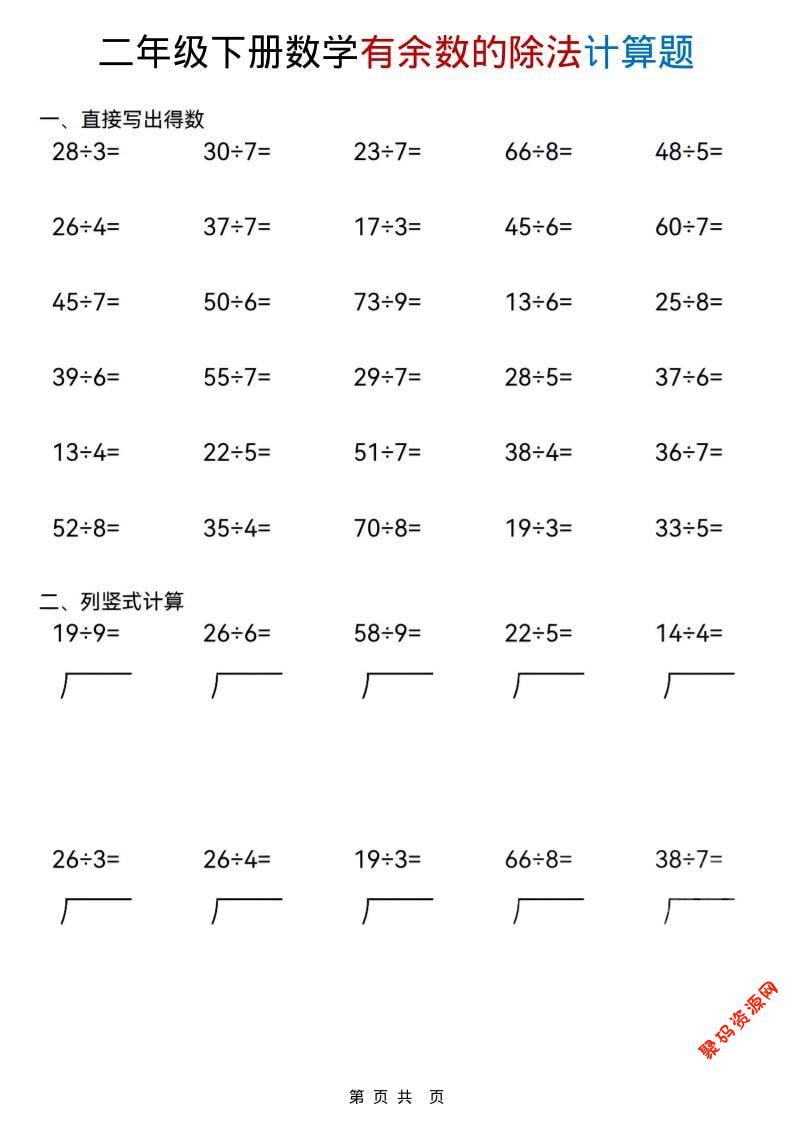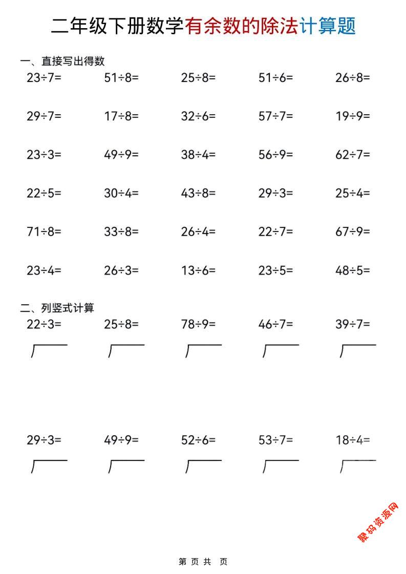 聚码网 二年级 二年级下数学《有余数的除法》计算题 http://www.appstore168.com/119268.html
