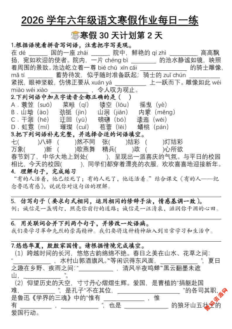 - 六年级语文下寒假作业每日一练30天 2026-02-17