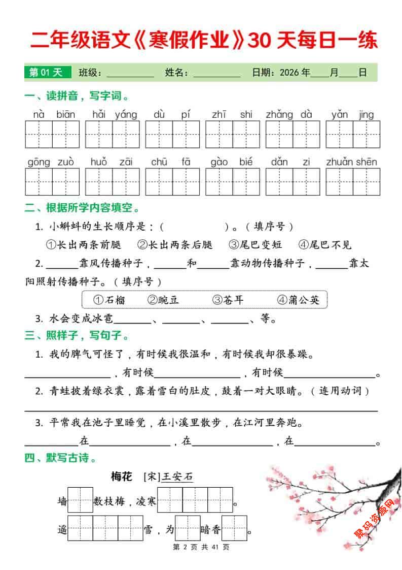 - 26春二年级语文下寒假作业30天每日一练打卡(含答案41页) 2026-02-15