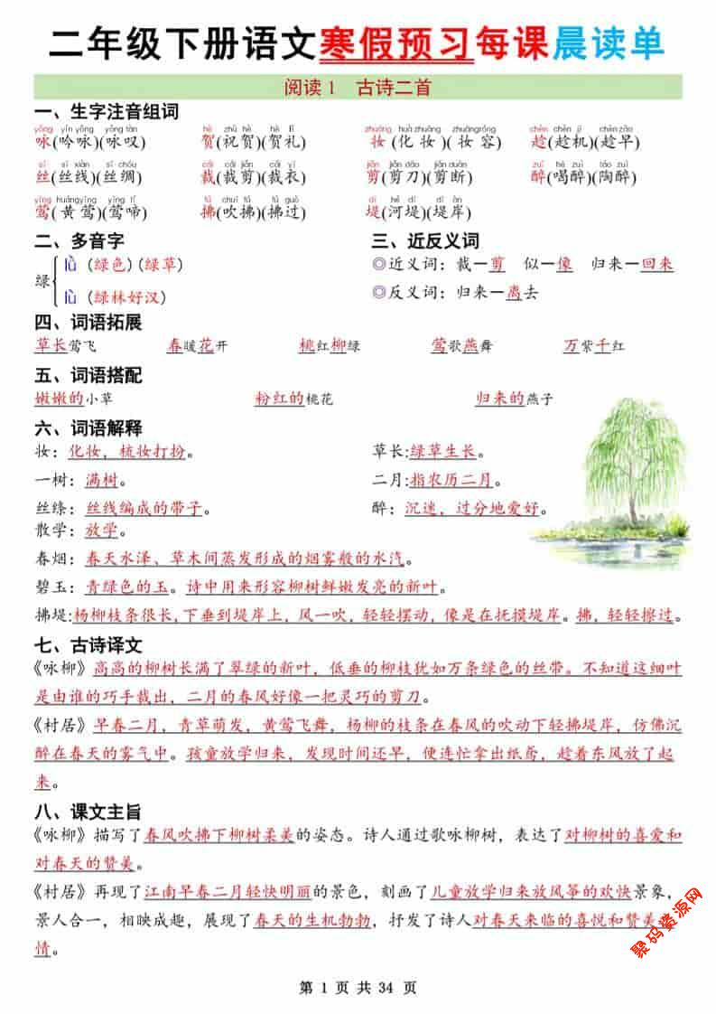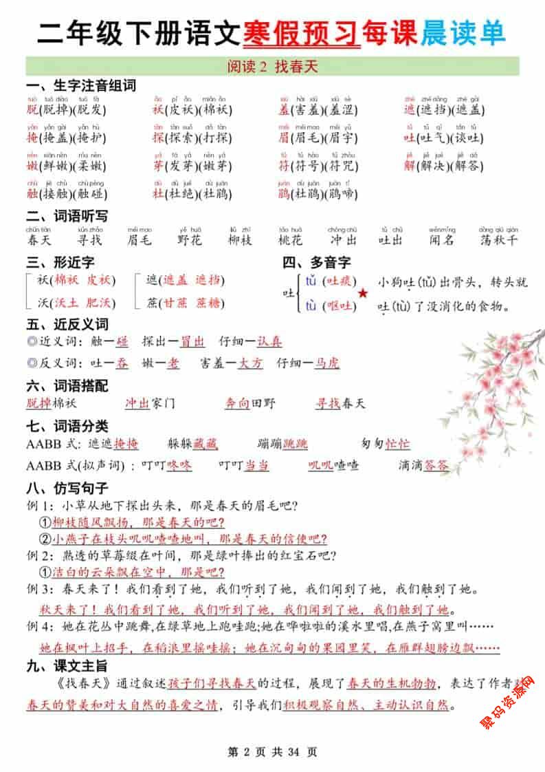 - 26春新二下语文寒假预习每课晨读单34页 2026-02-16