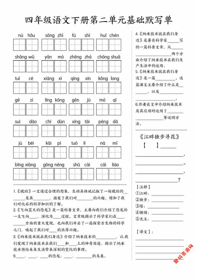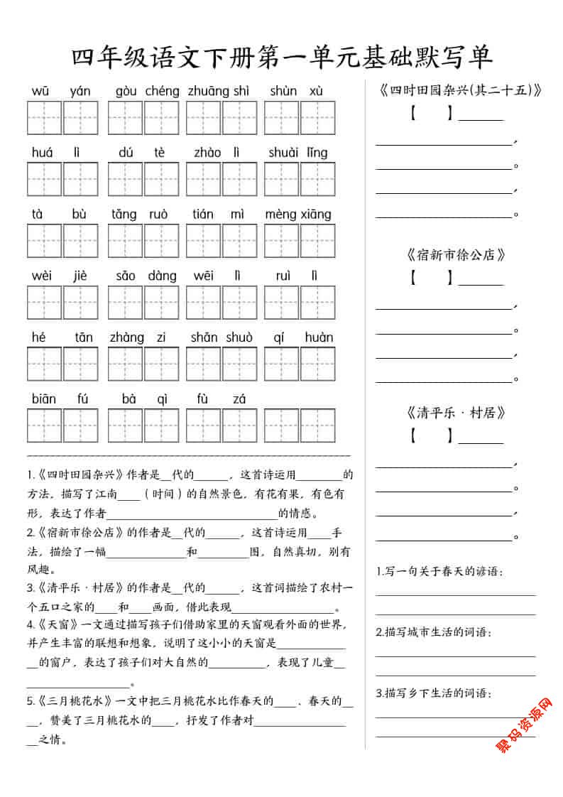 聚码网 四年级 四年级下语文基础默写单(1-8单元) http://www.appstore168.com/119390.html