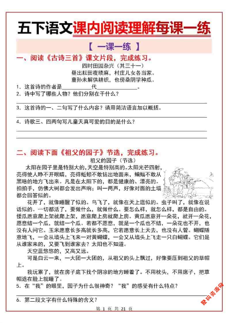 聚码网 五年级 五年级下语文课内阅读理解一课一练 http://www.appstore168.com/119409.html