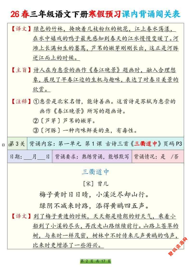 - 26春三下语文寒假预习必背内容背诵默写表20页 2026-02-15