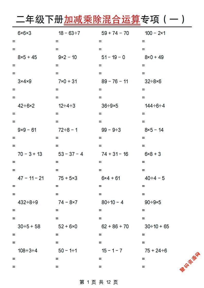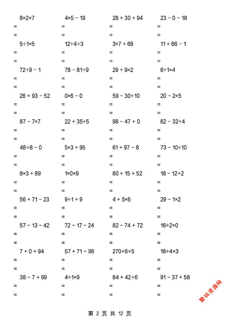 聚码网 二年级 二年级下数学加减乘除混合运算专项 http://www.appstore168.com/119856.html