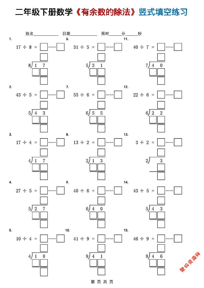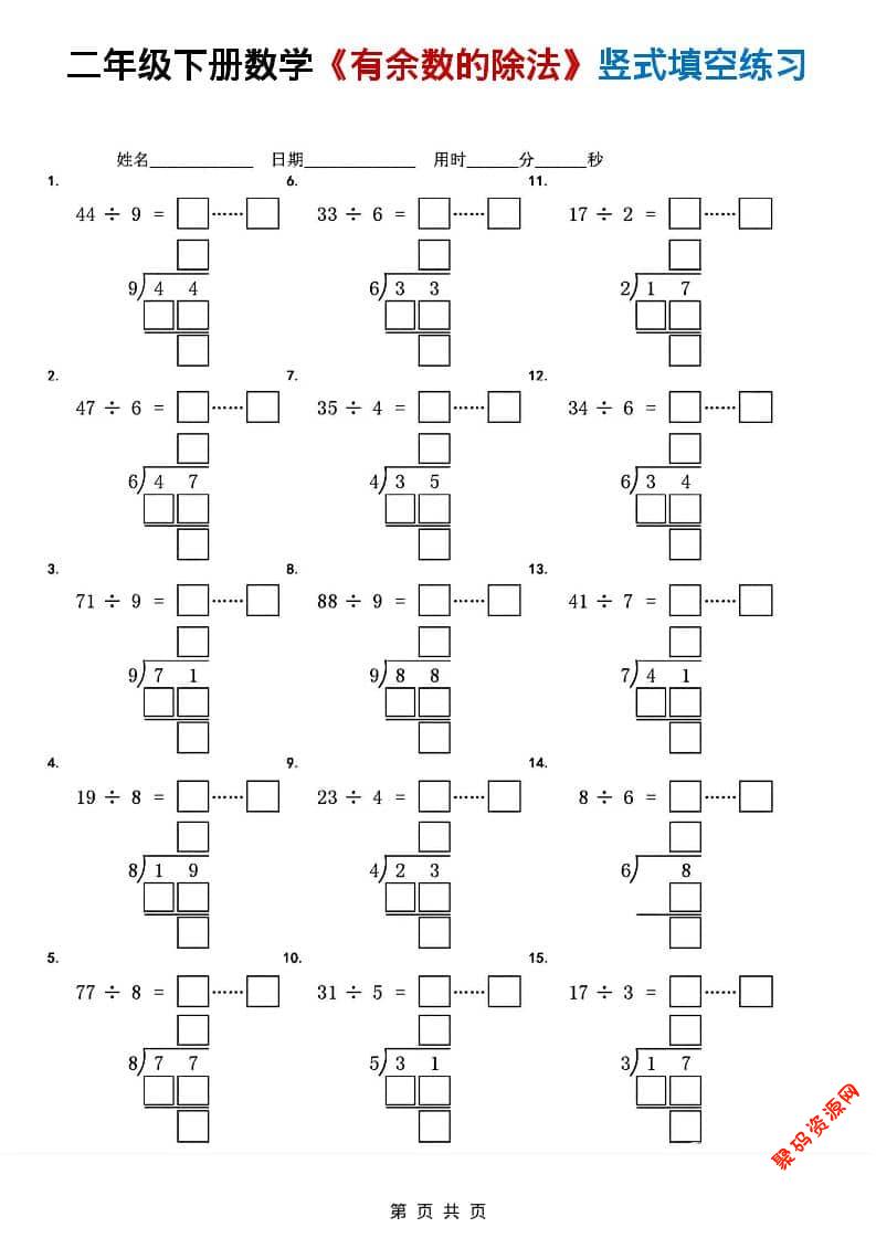 聚码网 二年级 二年级下数学《有余数的除法》竖式填空练习 http://www.appstore168.com/119862.html