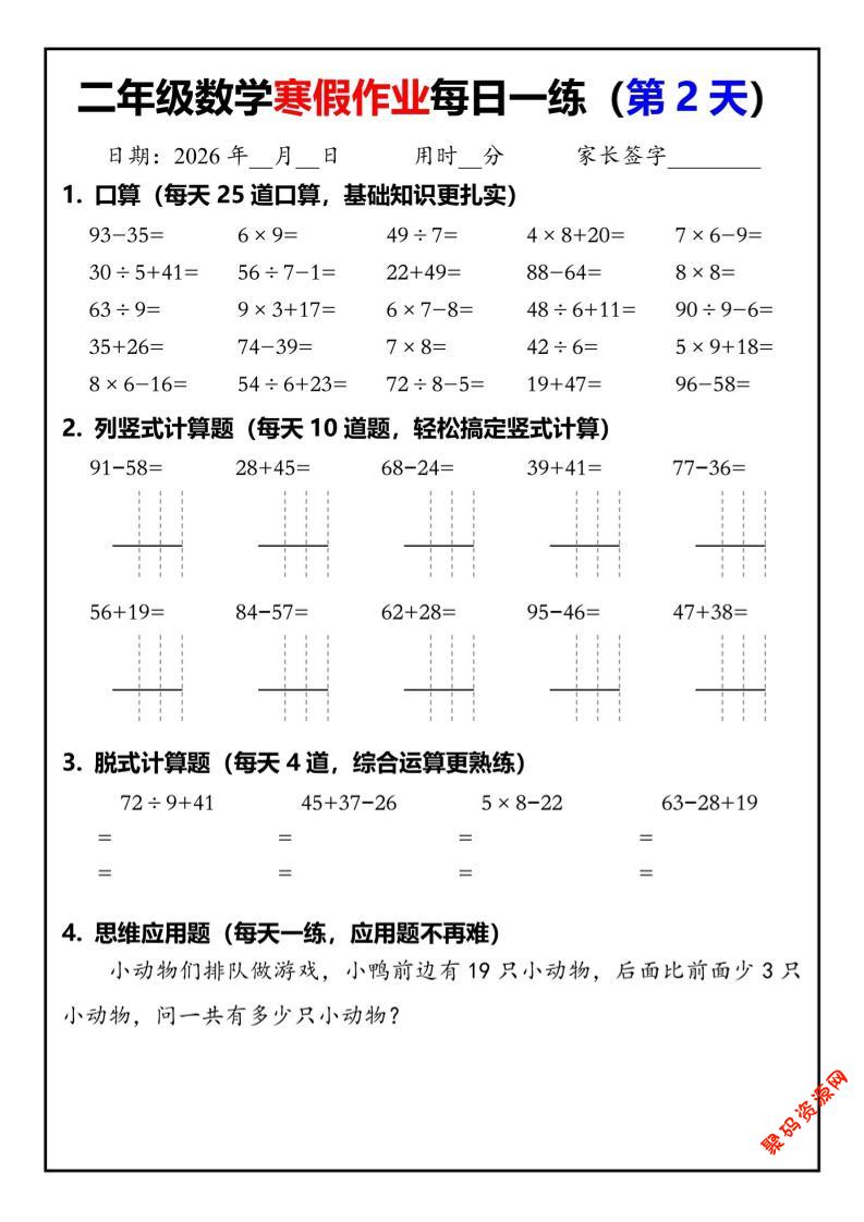 聚码网 二年级 26春二年级数学下寒假作业每日一练30天(口算竖式脱式应用题)30页 http://www.appstore168.com/120246.html