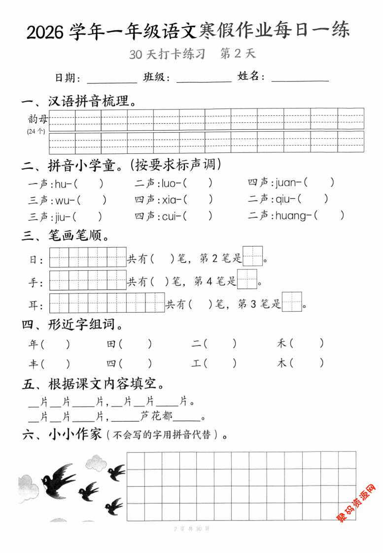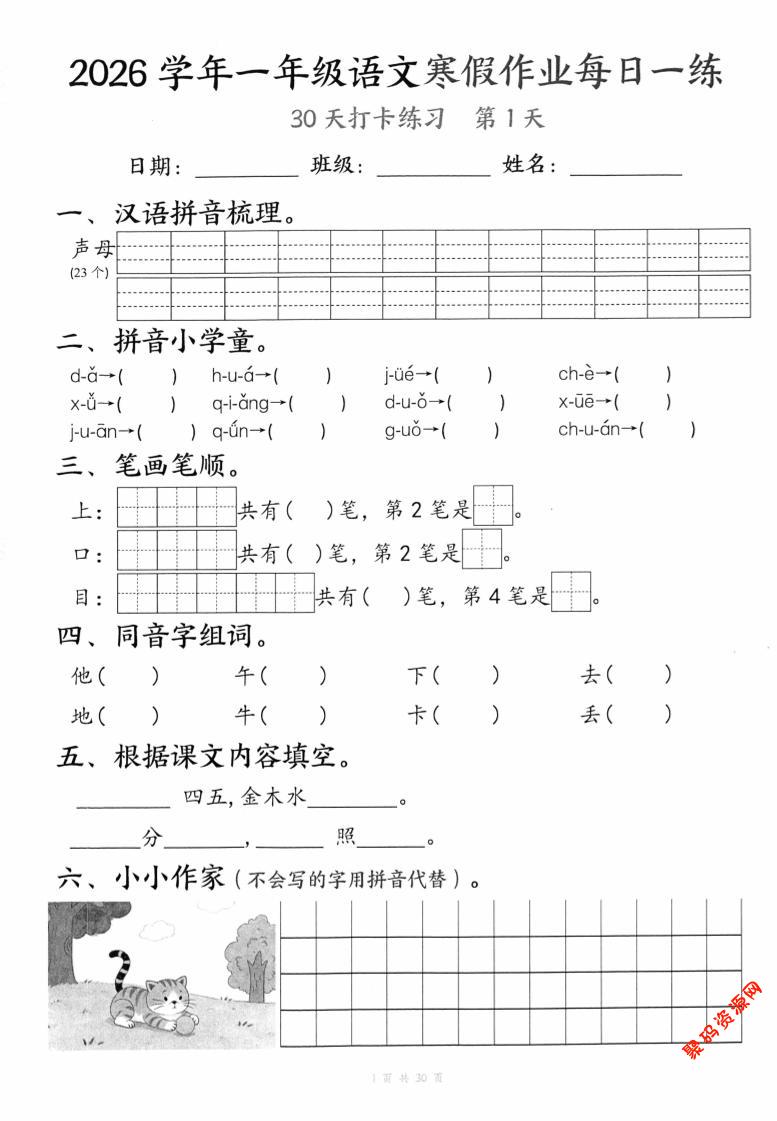 聚码网 一年级 26学年一年级语文下寒假作业每日一练30天(30页) http://www.appstore168.com/120414.html