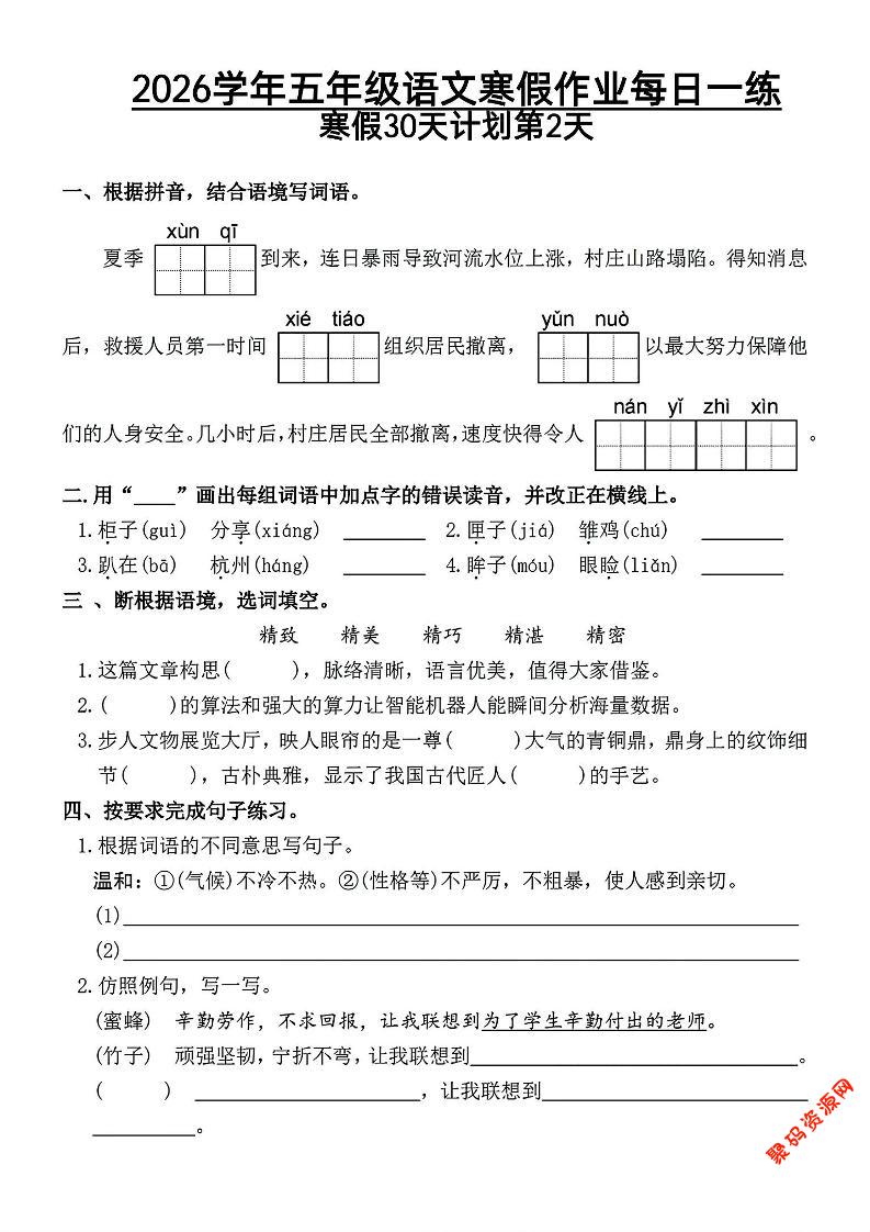- 2026五年级语文下寒假作业每日一练 2026-02-16