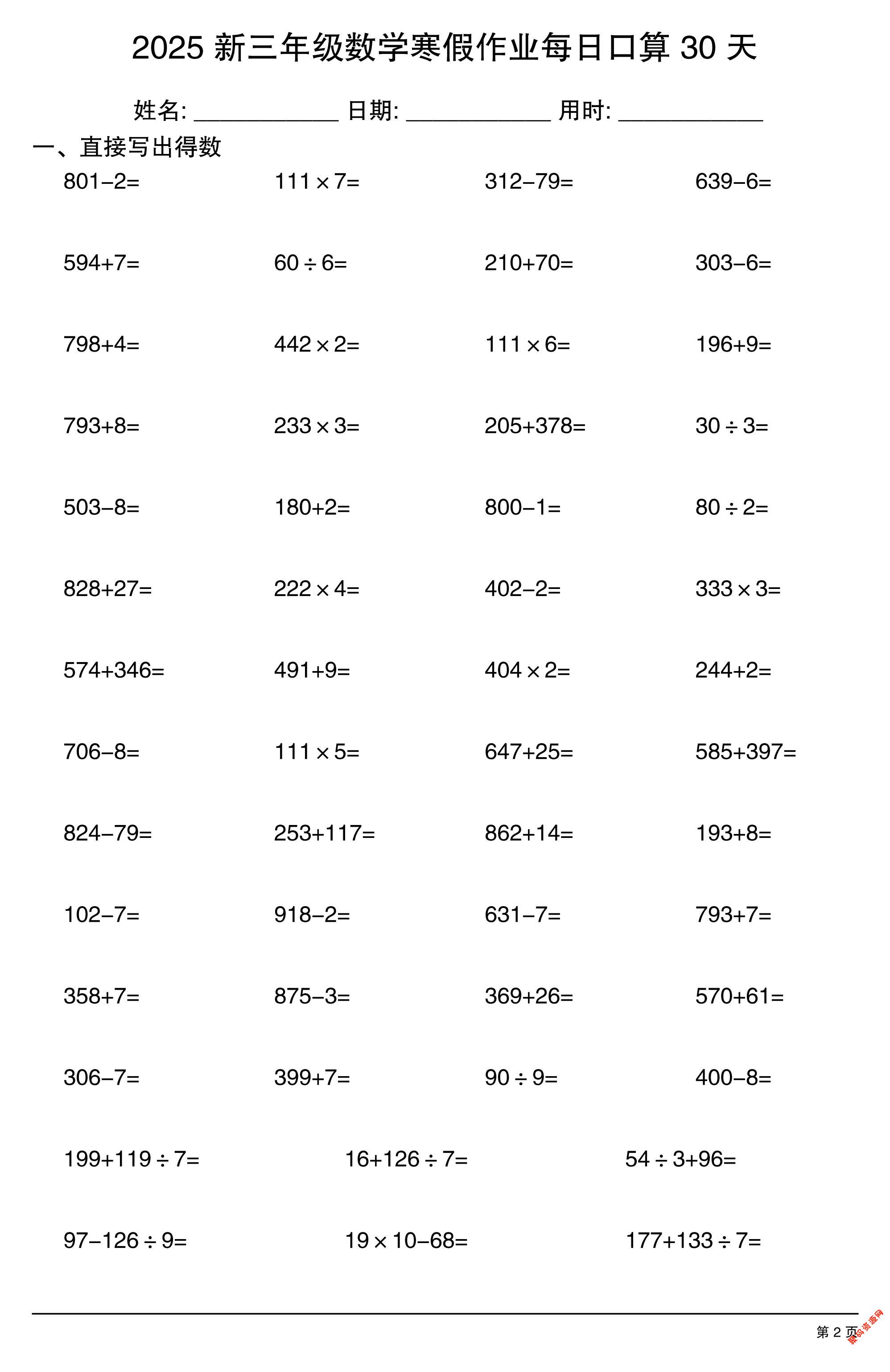 - 三下数学寒假作业每日口算30天 2026-02-17