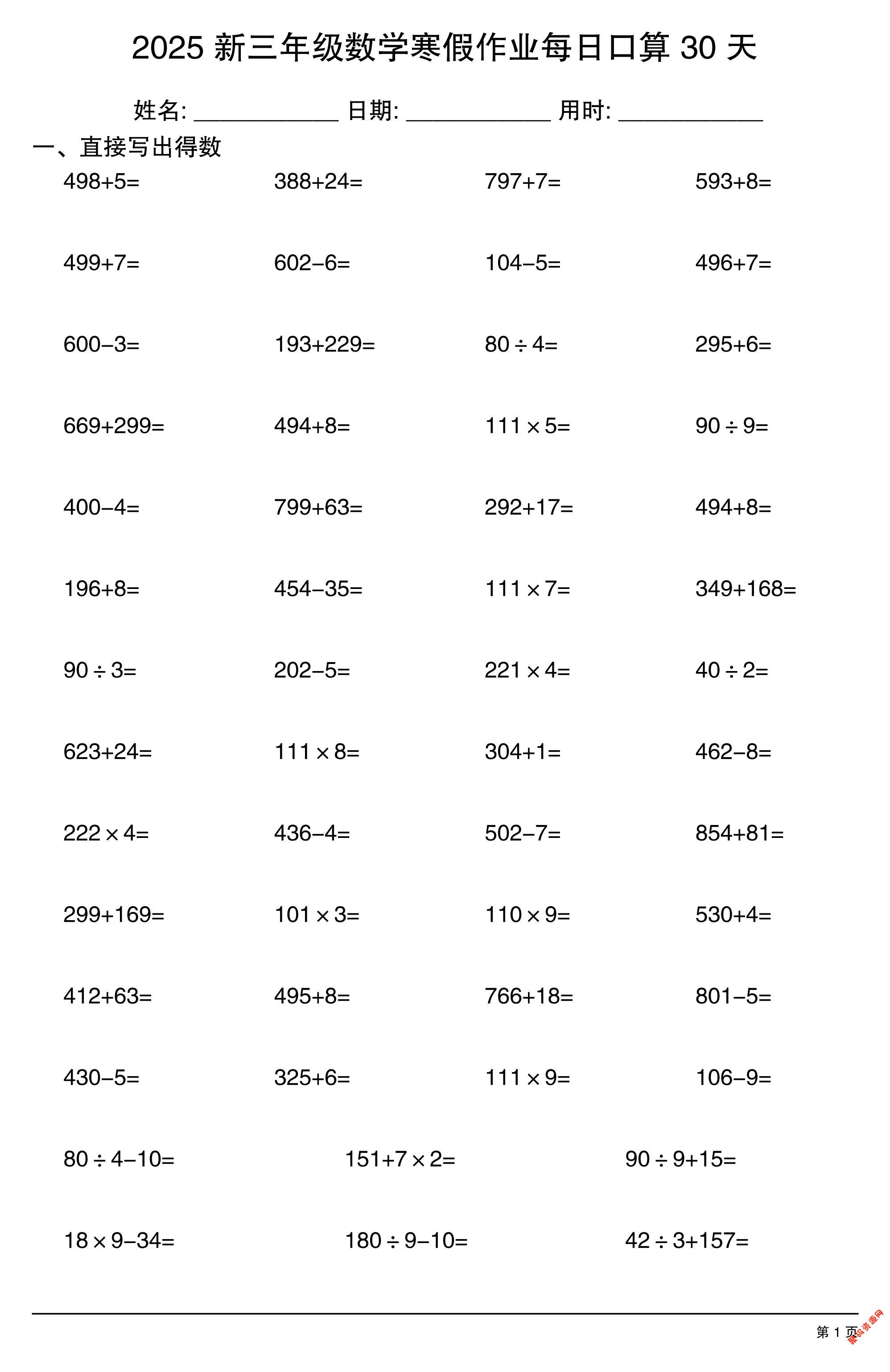 聚码网 三年级 三下数学寒假作业每日口算30天 http://www.appstore168.com/120561.html