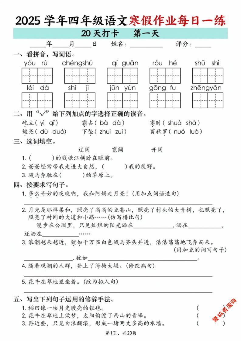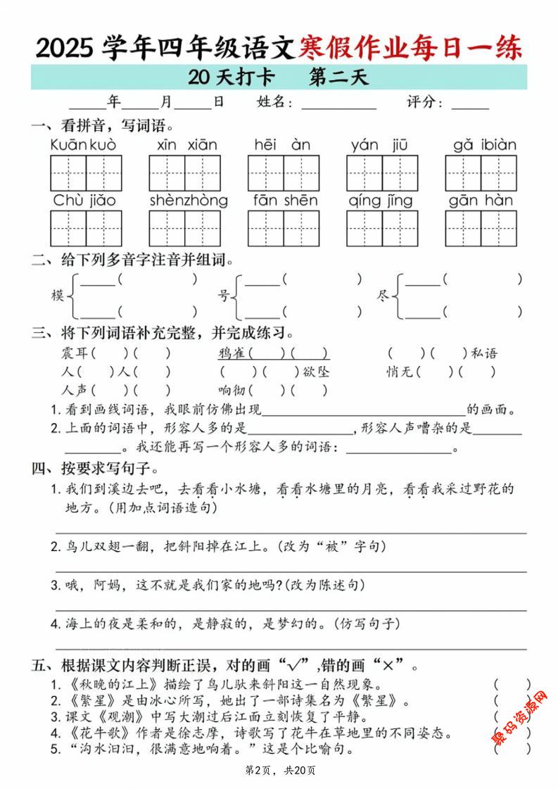 - 四年级语文下寒假作业每日一练20天(20页) 2026-02-18