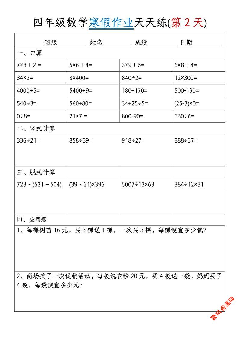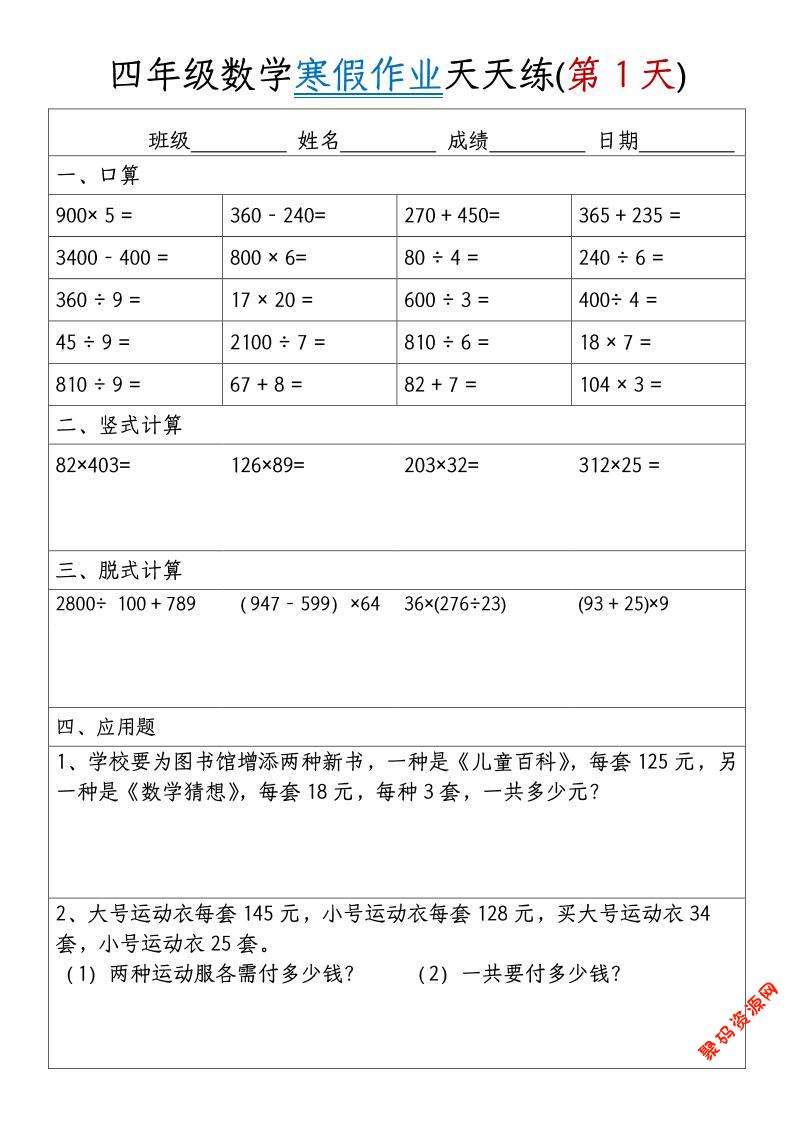 聚码网 四年级 四年级数学下寒假作业天天练30天【无答案】 http://www.appstore168.com/120611.html