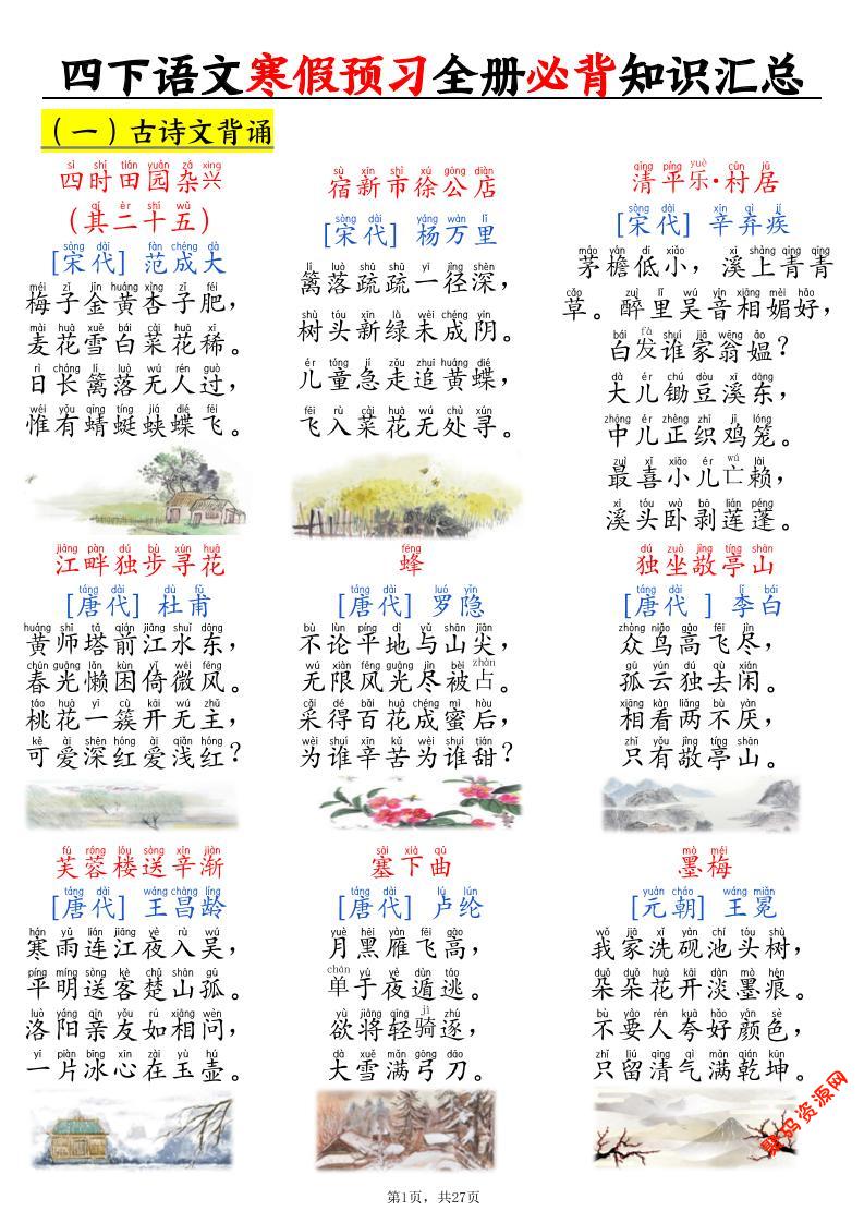 聚码网 四年级 四下语文寒假预习全册必背知识汇总27页 http://www.appstore168.com/120623.html