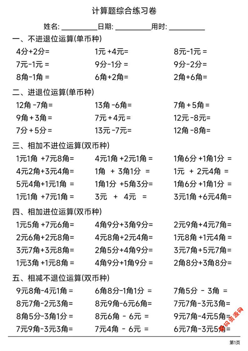 聚码网 一年级 一年级下数学人民币计算题综合练习卷 http://www.appstore168.com/120787.html