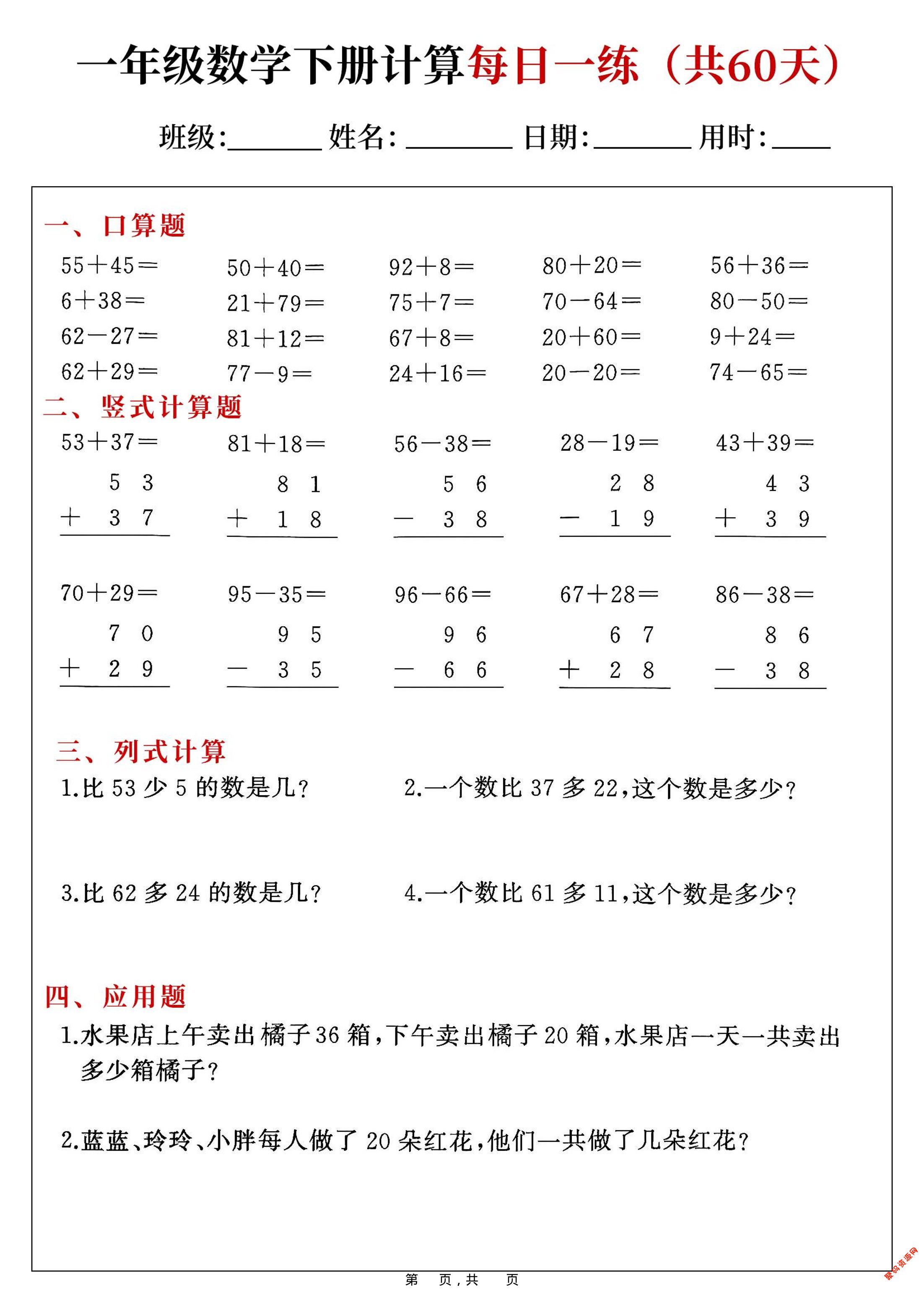 - 一年级下数学100以内加减法口算卡800道 2026-02-24