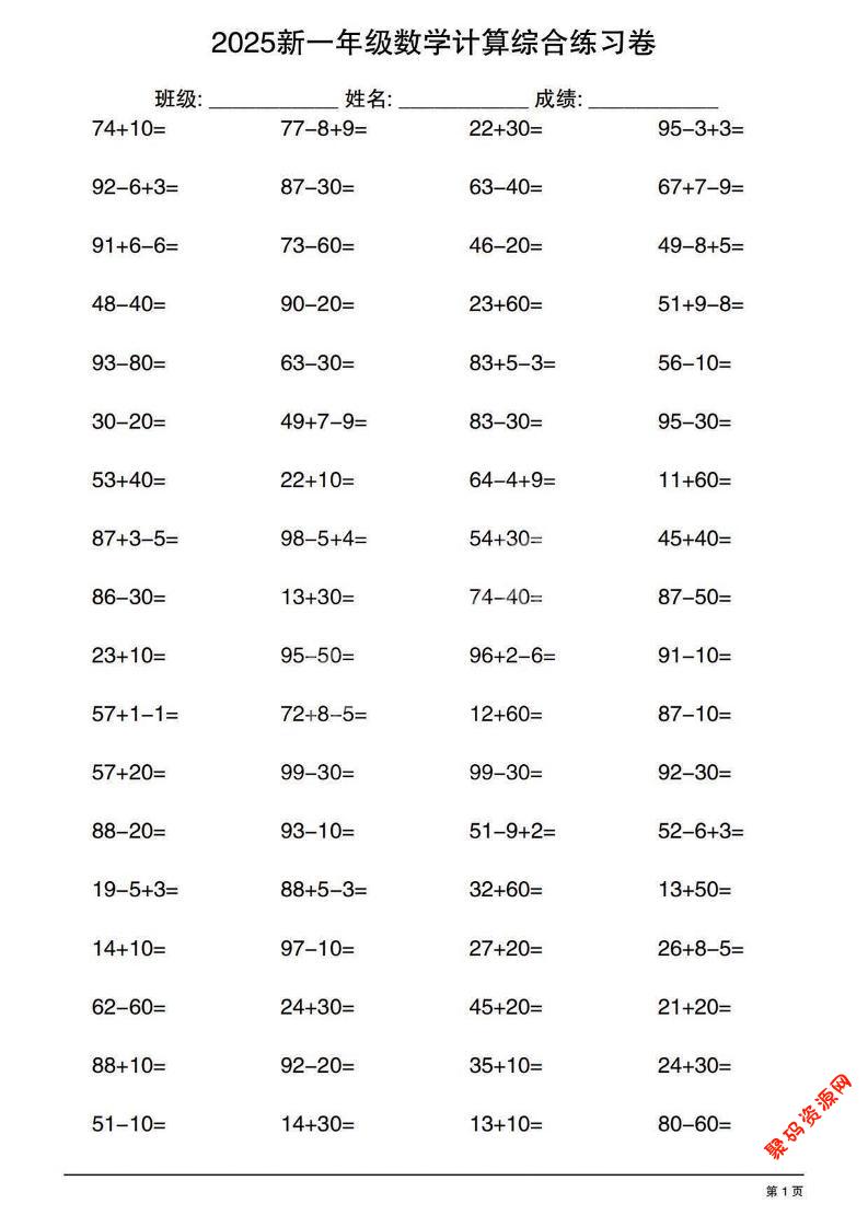 聚码网 一年级 一年级下数学100以内计算综合练习卷 http://www.appstore168.com/121102.html