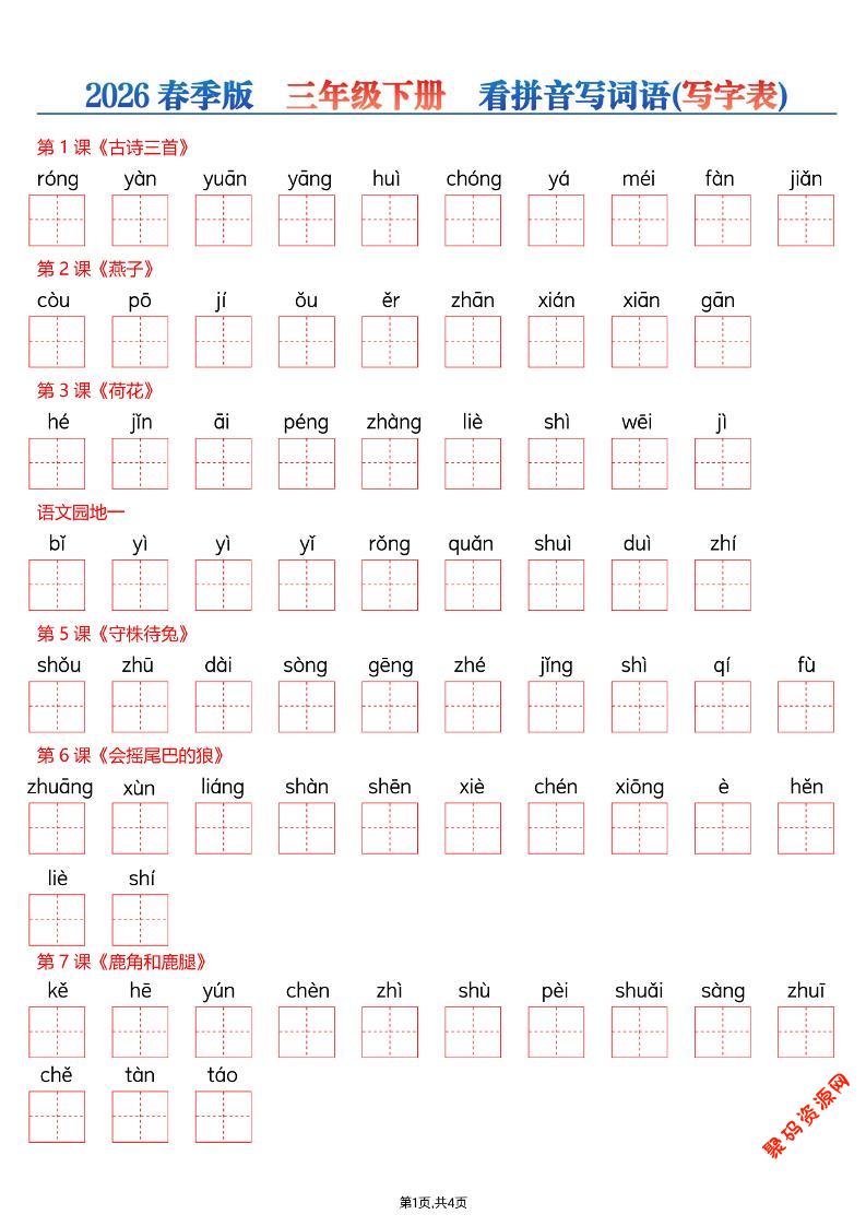 聚码网 三年级 26春三年级下册语文看拼音写词语—写字表 http://www.appstore168.com/121108.html