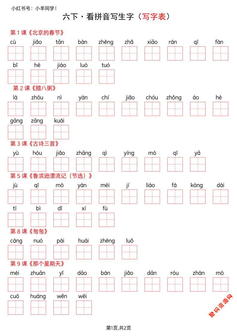 聚码网 六年级 六下语文看拼音写生字–写字表(空白) http://www.appstore168.com/121291.html