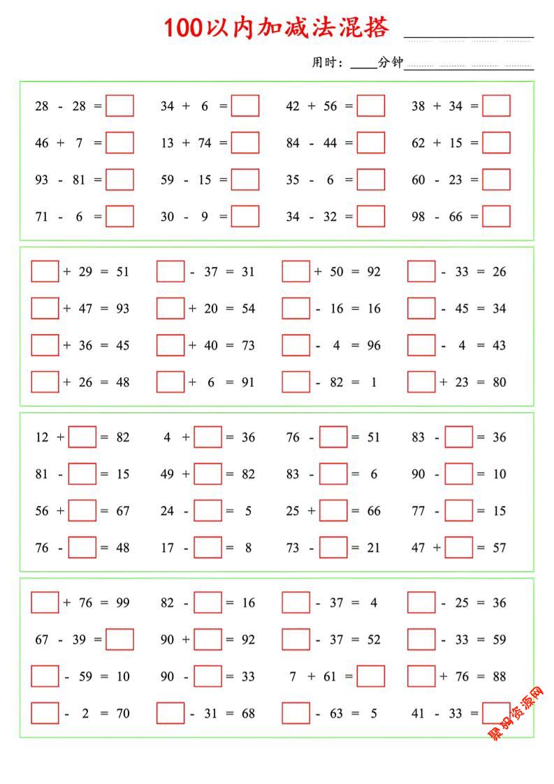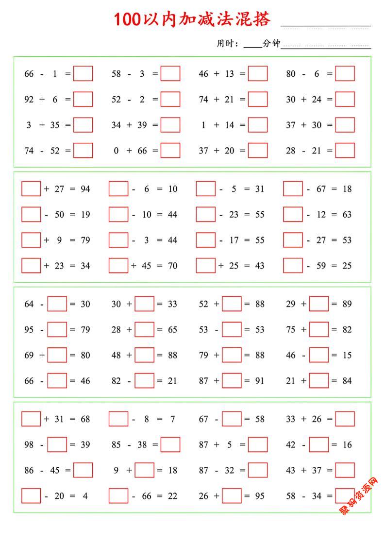 聚码网 一年级 一年级下数学100以内口算加减法混搭 http://www.appstore168.com/121504.html