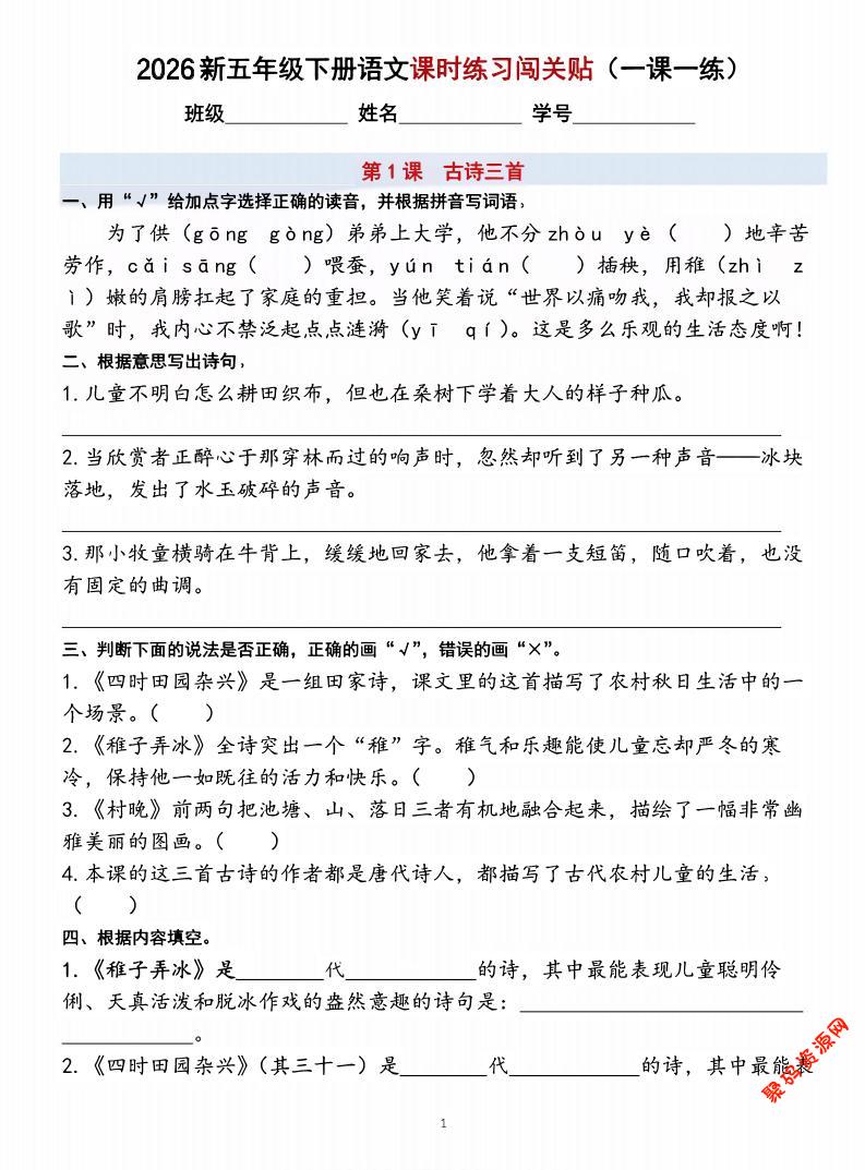- 26五下语文课时练习闯关贴(一课一练)含答案40页 2026-02-26
