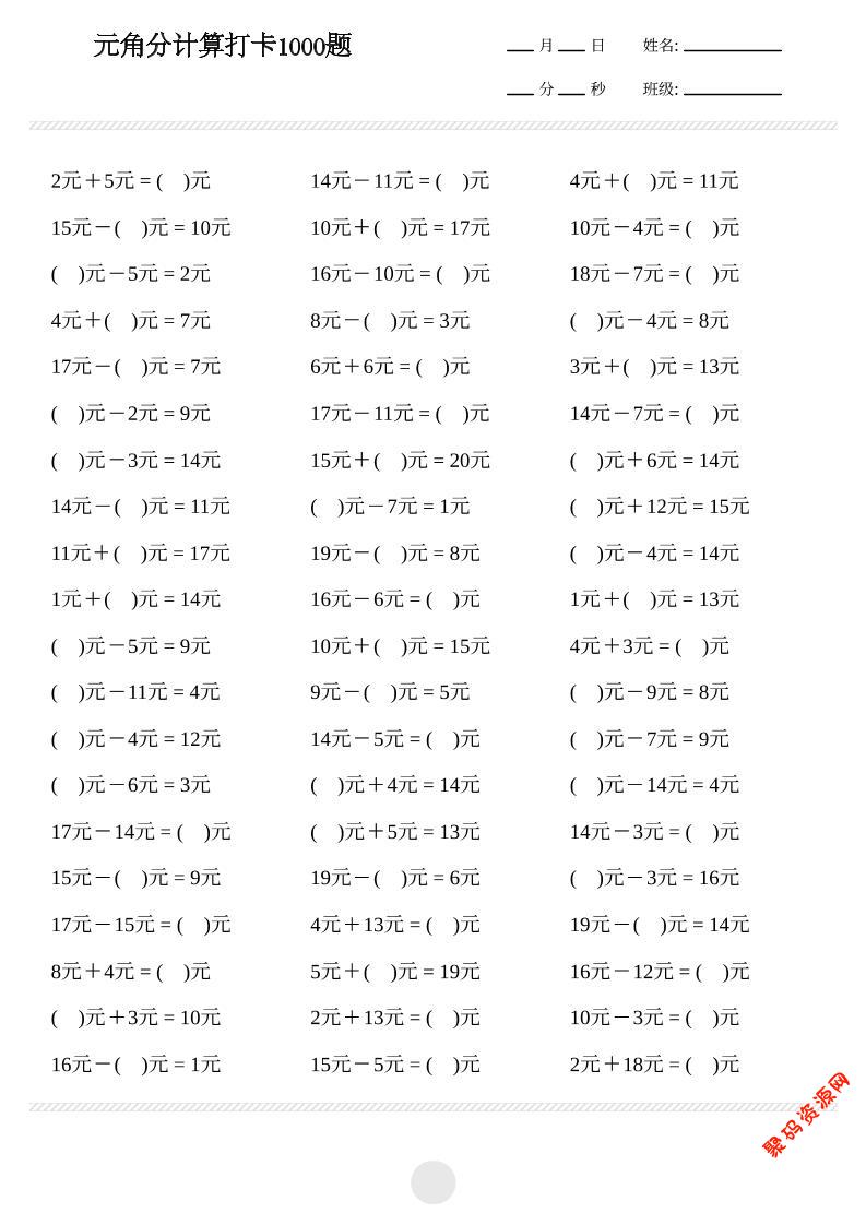 聚码网 一年级 一年级下数学元角分计算专项练习1000题 http://www.appstore168.com/121679.html