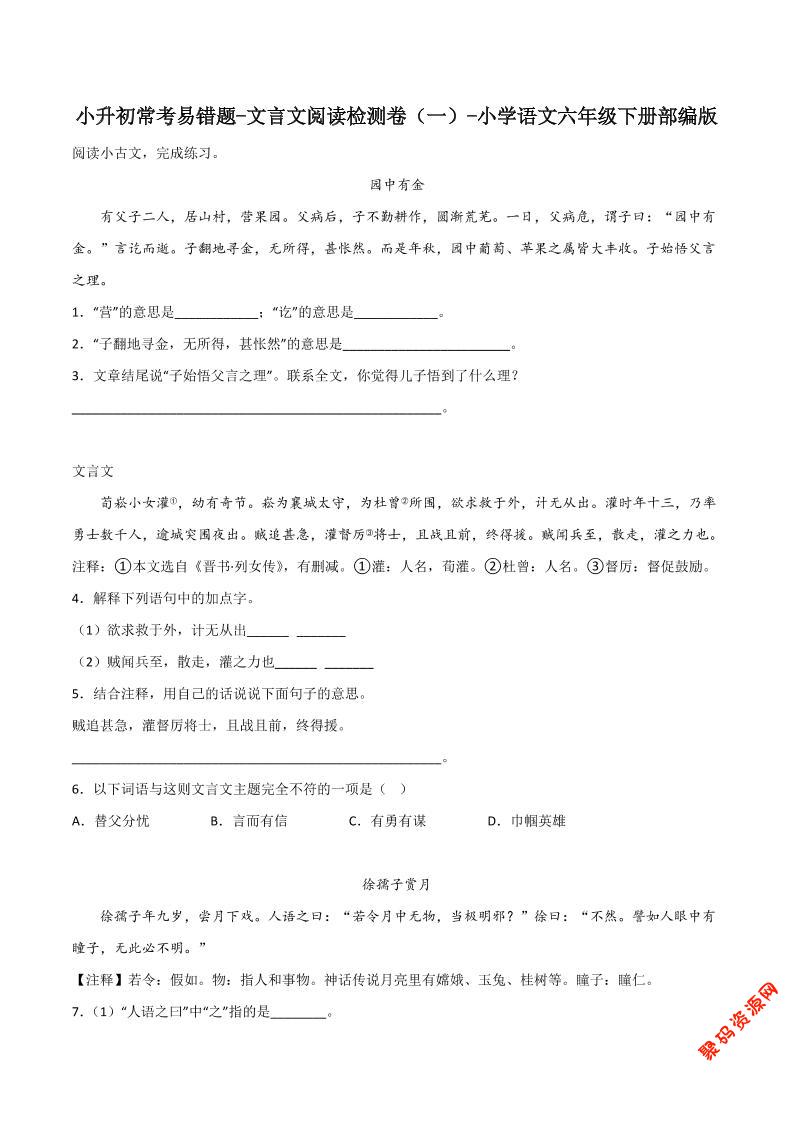 聚码网 六年级 六下丨语文小升初常考易错题-文言文阅读检测卷 http://www.appstore168.com/121990.html