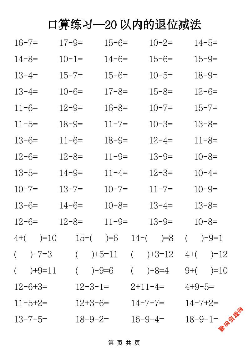 - 一年级下数学20以内退位减法专项练习 2026-02-27