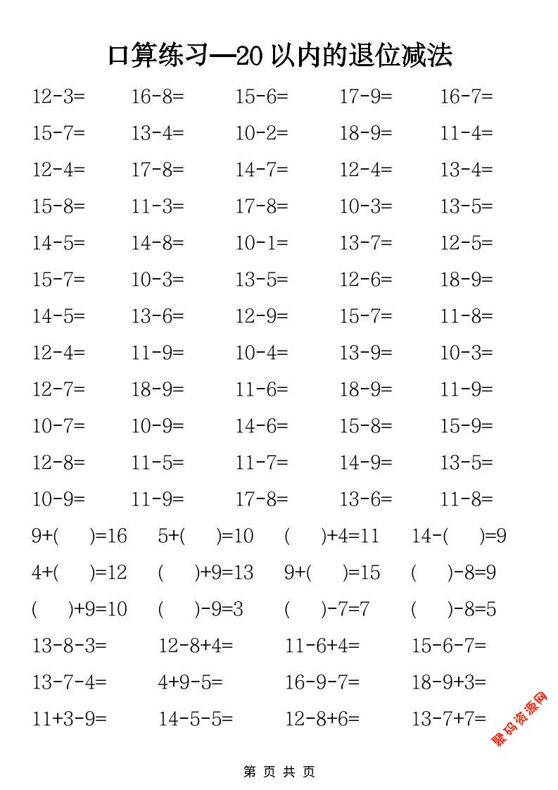 聚码网 一年级 一年级下数学20以内退位减法口算练习 http://www.appstore168.com/122008.html