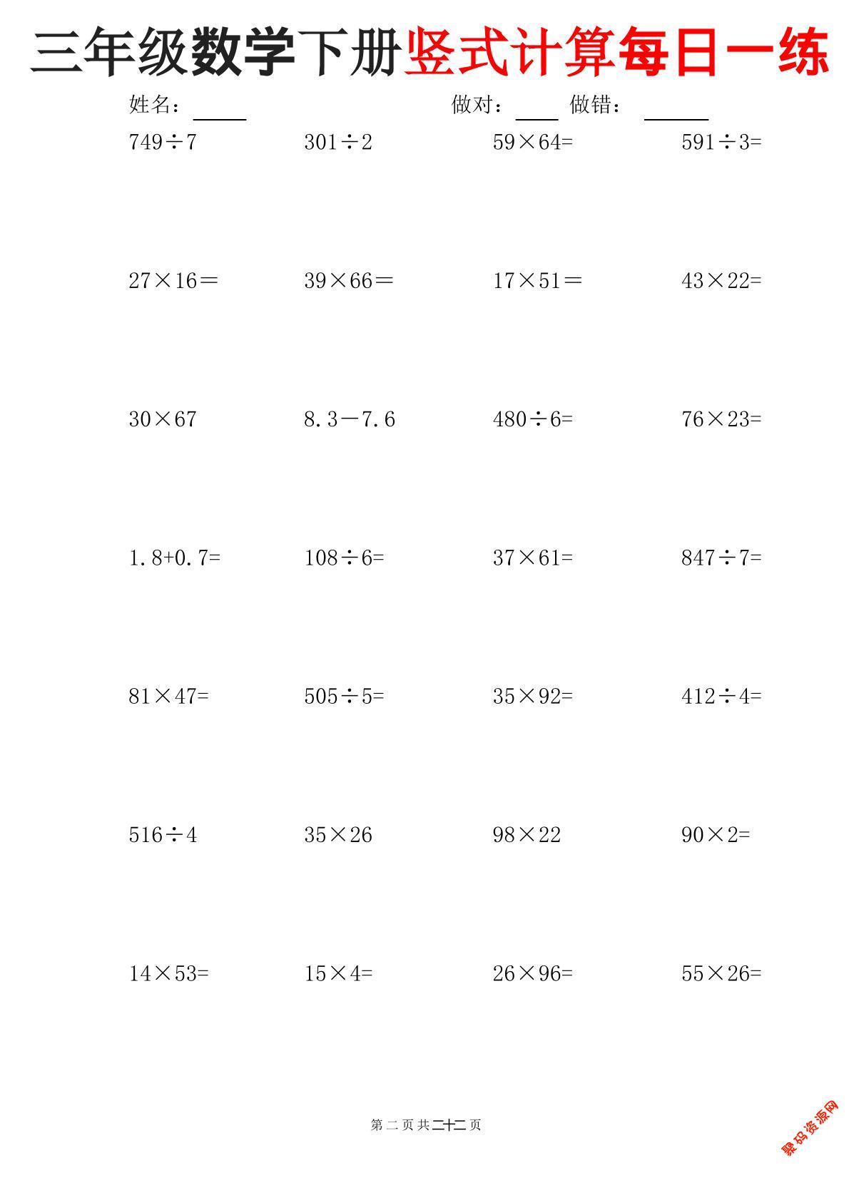 聚码网 三年级 三下数学竖式计算每日一练22页 http://www.appstore168.com/122251.html