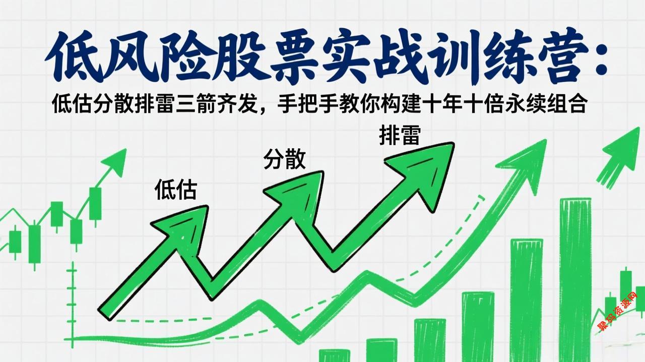 这是一套系统化的低风险股票投资实战课程,旨在帮助学员建立稳健盈利的投资体系。课程共10节,从投资哲学出发,系统讲解低估值组合投资的核心理念——低估买入、分散持仓、排雷筛选,追求十年十倍收益目标。课程深入剖析股票估值方法(市盈率与市净率)、组合构建策略(30只股票跨行业配置)、仓位控制公式(根据市场整体市净率动态调整)、买入标准(三好学生模型与财务排雷)以及卖出逻辑(涨幅达标分批止盈)。同时,课程用两讲专门锤炼投资思维,涵盖组合思维、配置思维、指数思维、长期思维、理财思维、终局思维、概率思维与无限思维,帮助学员从认知底层建立稳健不亏钱的交易系统,真正实现有钱有闲、越老越富的财富人生。