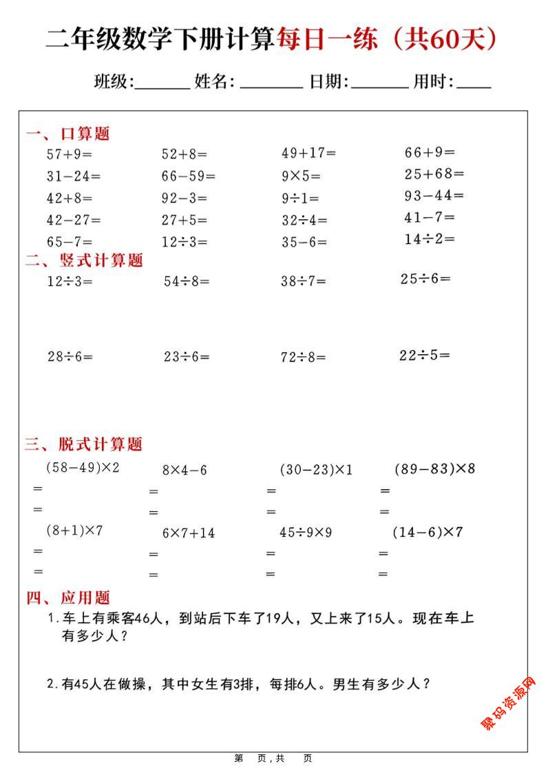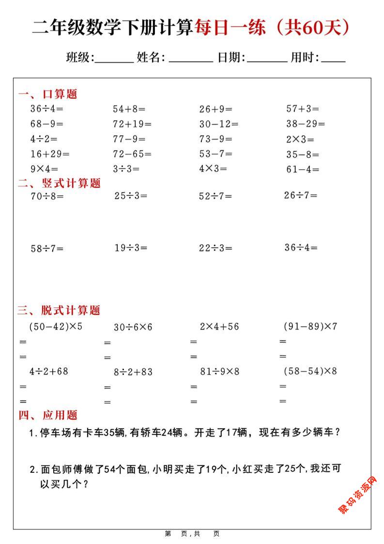 - 二年级下数学口算应用专项每日一练 2026-03-02