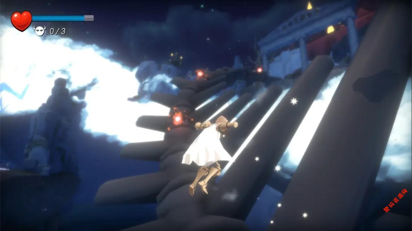 游戏分为五个章节,分别对应战神阿瑞斯、狩猎女神阿尔忒弥斯、冥王哈迪斯、海神波塞冬与主神宙斯的领域。每个神域包含三个大型平台关卡,布满陷阱、敌人与隐藏收集品。