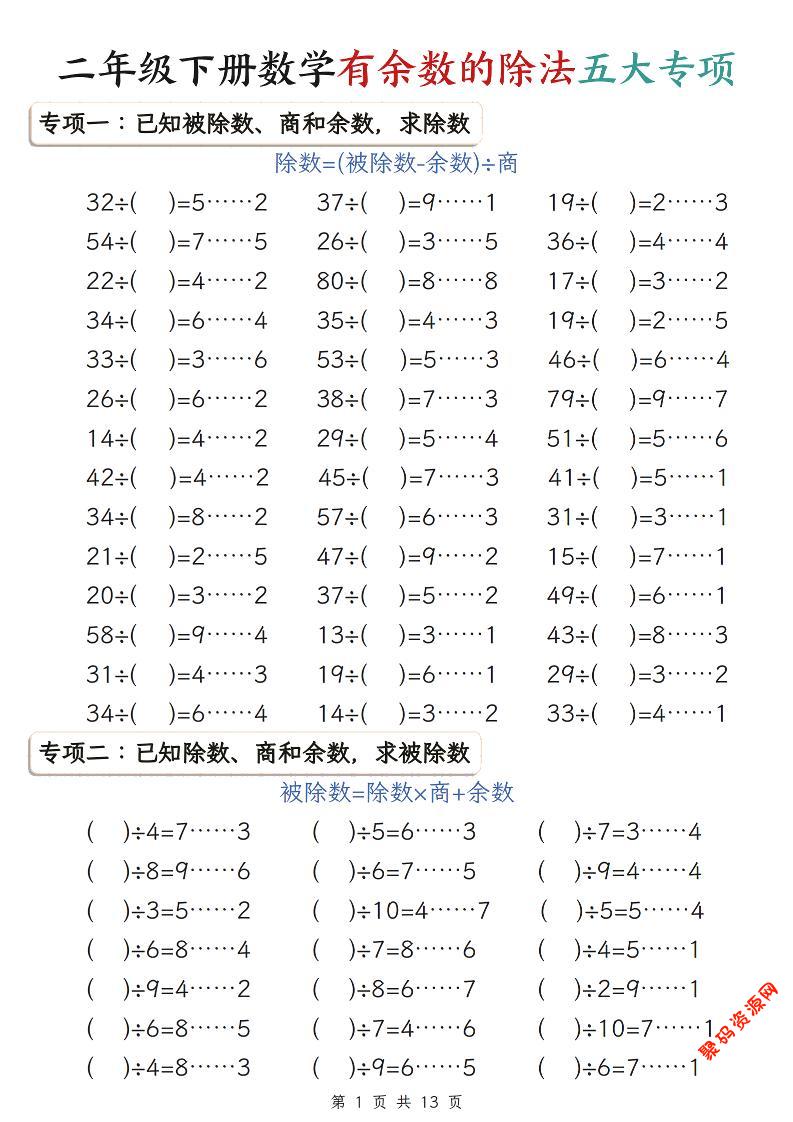 聚码网 二年级 二年级下数学有余数的除法五大专项练习 http://www.appstore168.com/122970.html