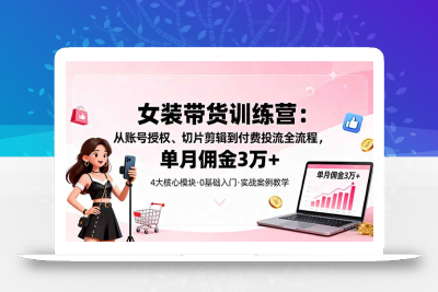 本课程为短视频女装带货实战训练营,从账号授权、切片剪辑到付费投流全流程拆解,覆盖7大核心模块。通过低门槛操作(0基础可学)和轻资产模式(单账号启动成本<500元),学员可实现单月佣金3万+