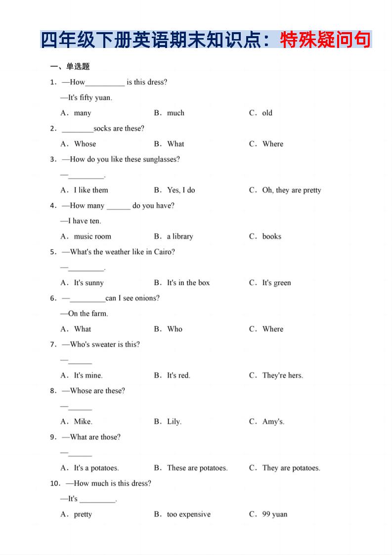 聚码网 四年级 四年级下英语期末疑问句知识点训练《PEP版》 http://www.appstore168.com/68229.html