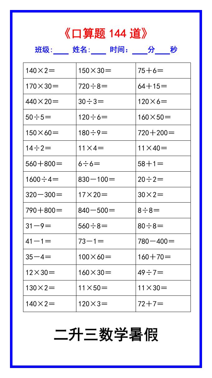 聚码网 三年级 二升三数学暑假《口算练习题144道》汇总-三上数学 http://www.appstore168.com/72090.html