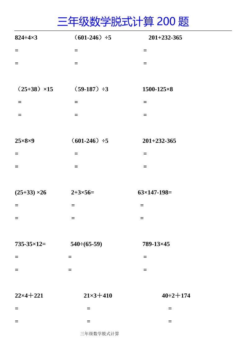 - 三上数学计算专项每日一练50天(口算填空竖式脱式解决问题思维题)50页 2025-10-27
