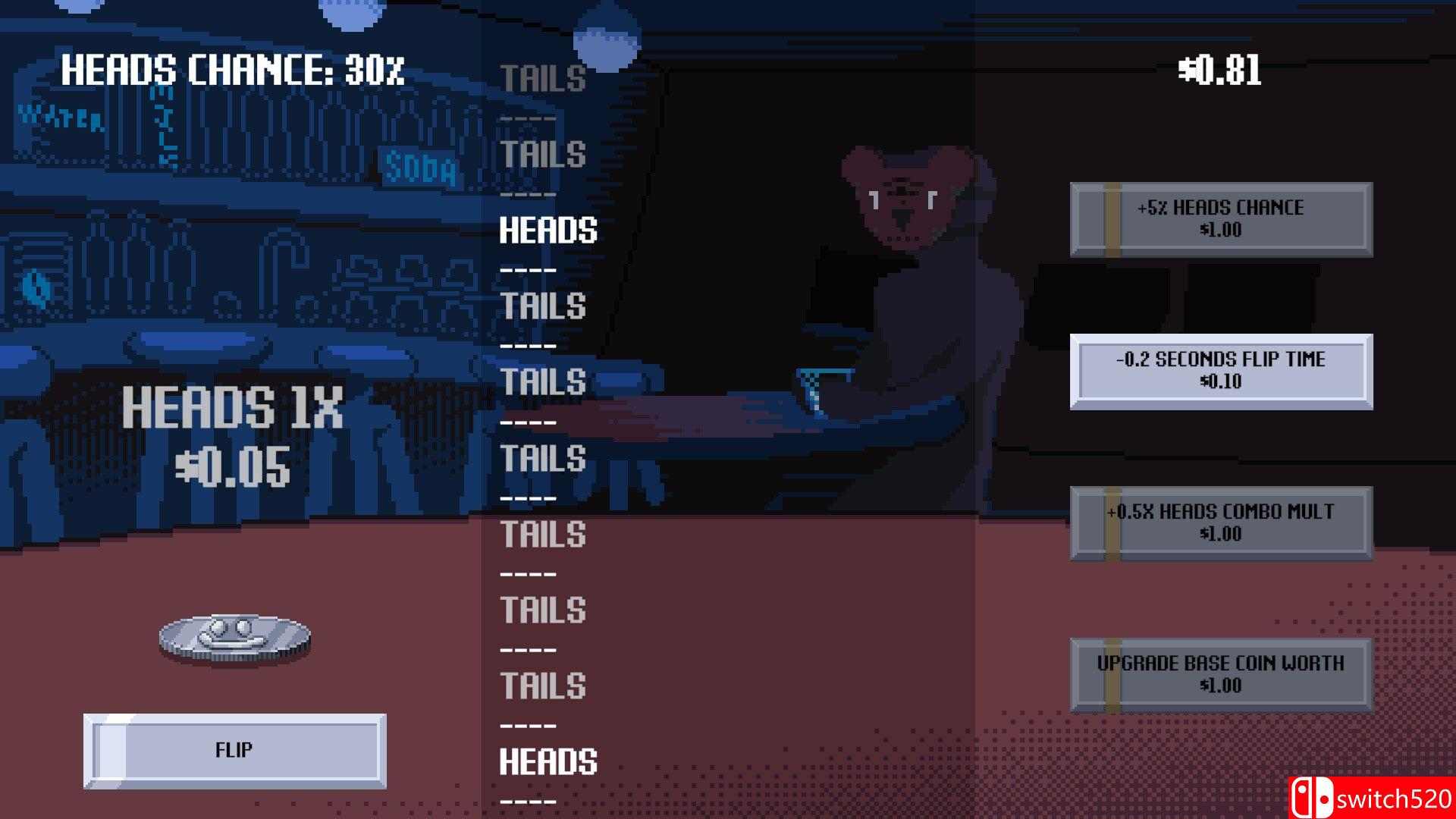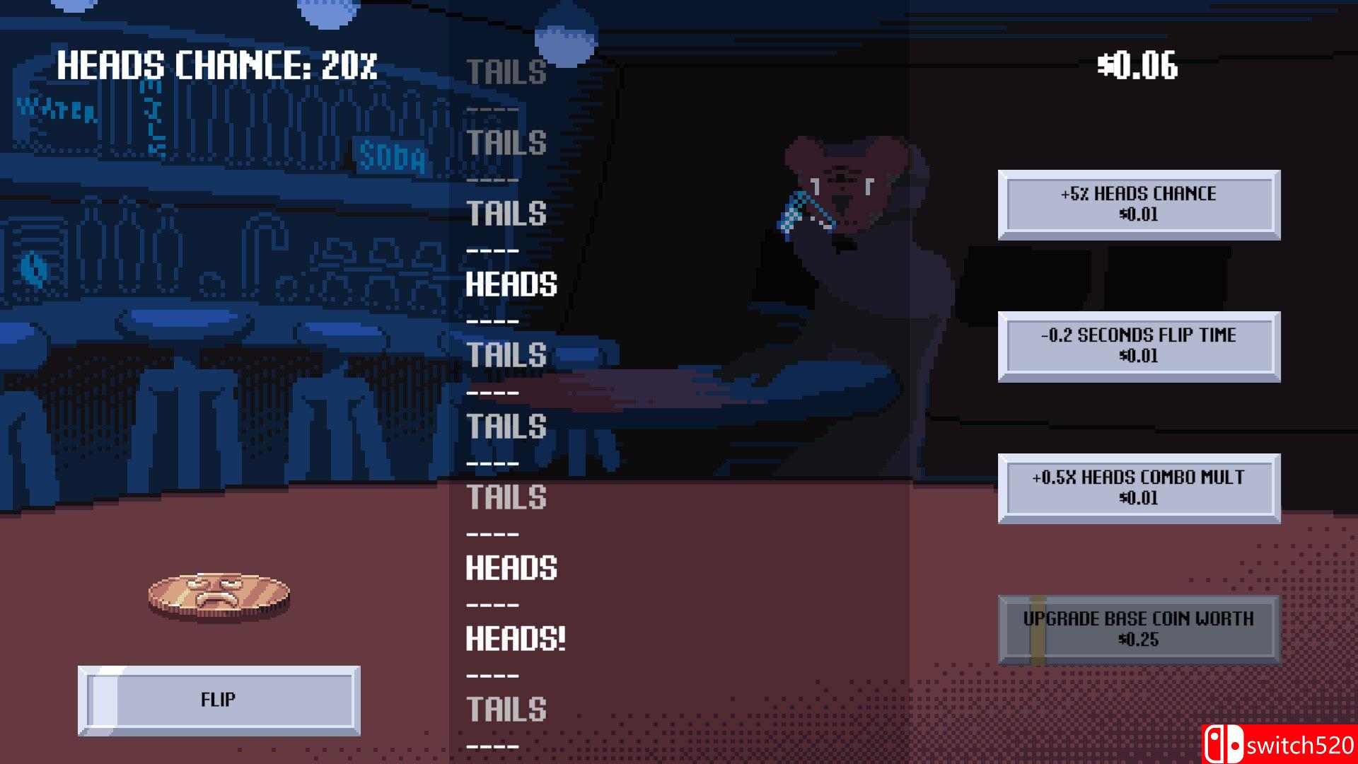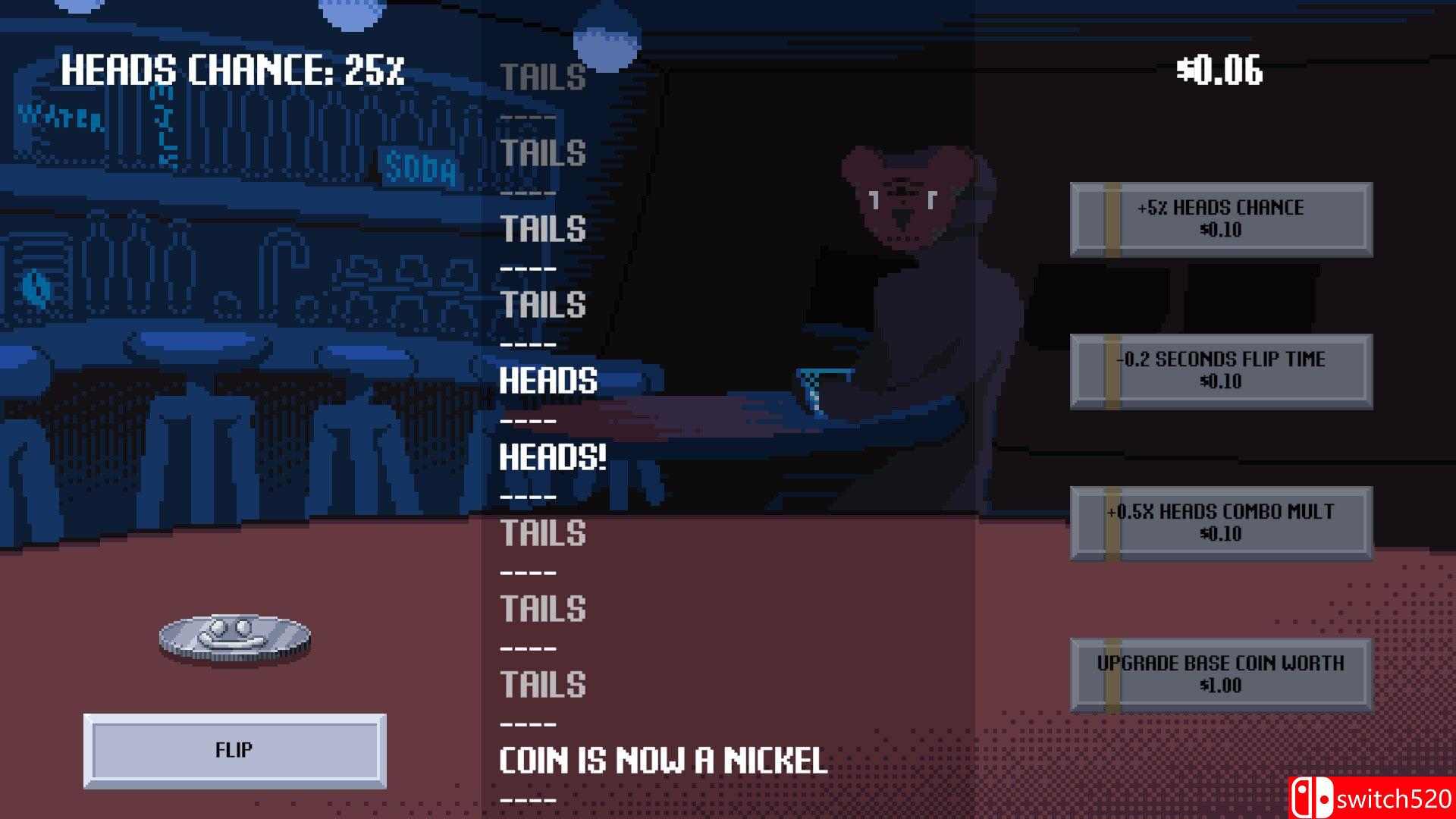 《不公平的抛硬币》是一款益智类(PUZ)游戏,《不公平的抛硬币》是一款短小的增量点击游戏,玩家需要不断地抛掷世界上最糟糕的硬币,直到连续十次正面朝上。游戏实践真正的随机性;每次抛掷硬币都有 20% 的概率出现正面,连续十次正面朝上的概率为 9,765,625 分之一。随着游戏的进行,玩家可以通过将正面连续在一起,升级硬币,从而提高成功的几率。然而,连续十次正面朝上永远无法得到保证。switch520