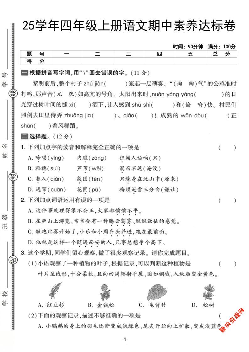 聚码网 四年级 25学年四上语文期中素养达标卷(含答案5页) http://www.appstore168.com/90403.html