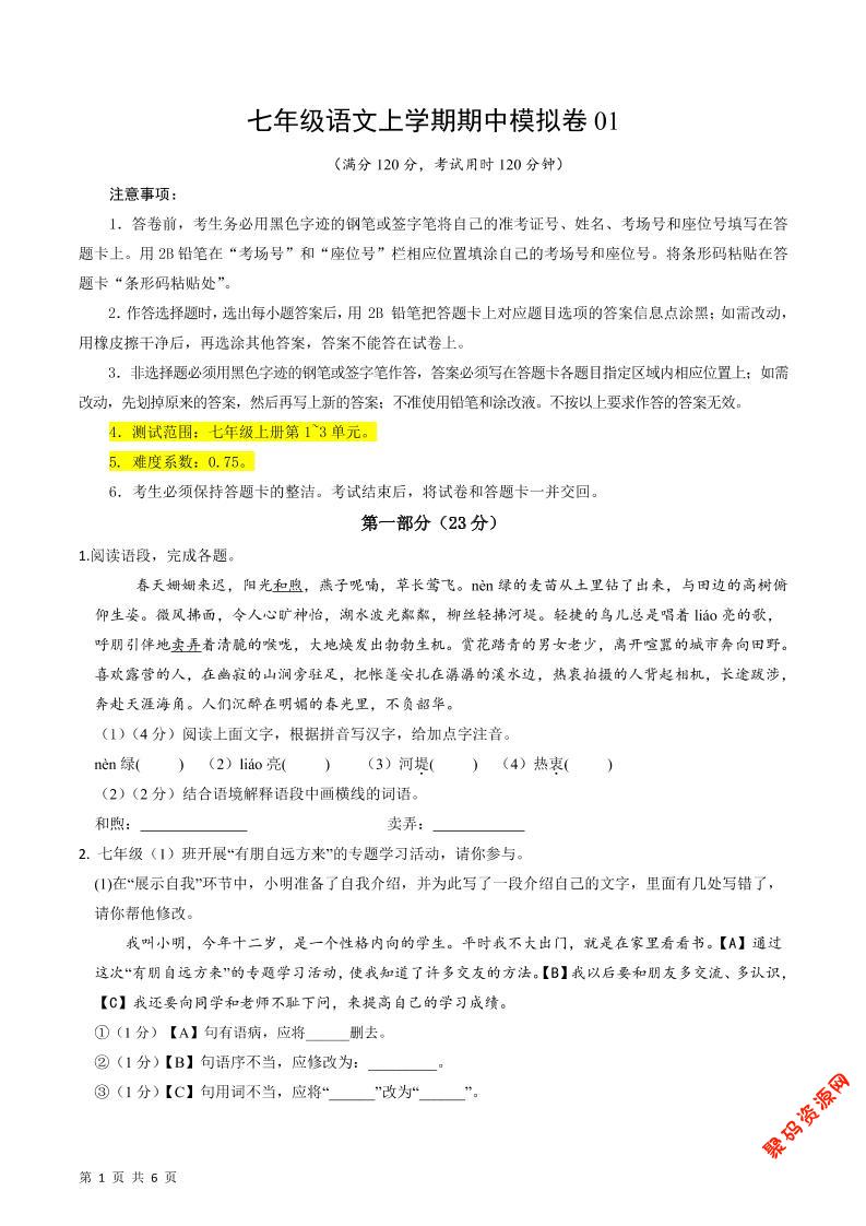 - 七年级上语文期中模拟卷01 2025-11-24