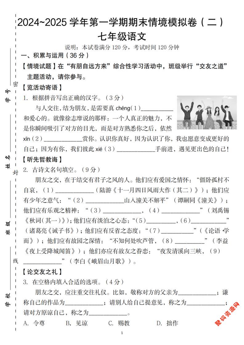 聚码网 七年级 七年级上语文第一学期语文期末情境模拟卷(二) http://www.appstore168.com/91754.html