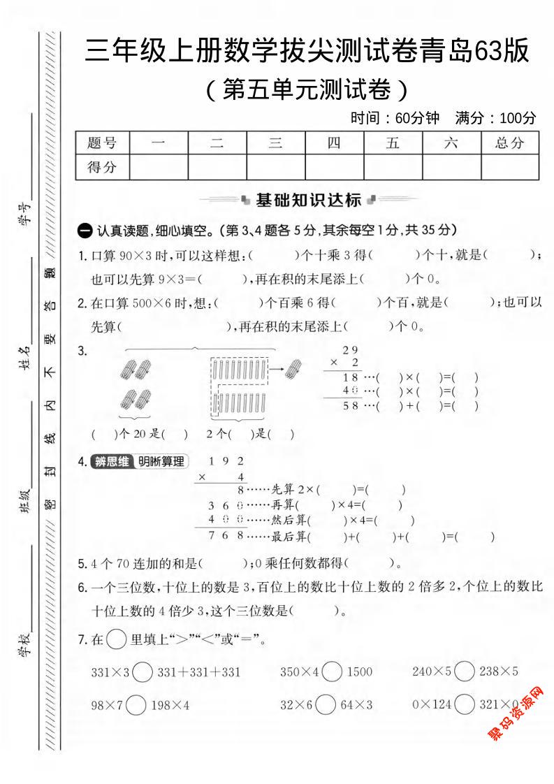 聚码网 三年级 三年级上数学第五单元拔尖测试卷1《青岛63版》 http://www.appstore168.com/92747.html