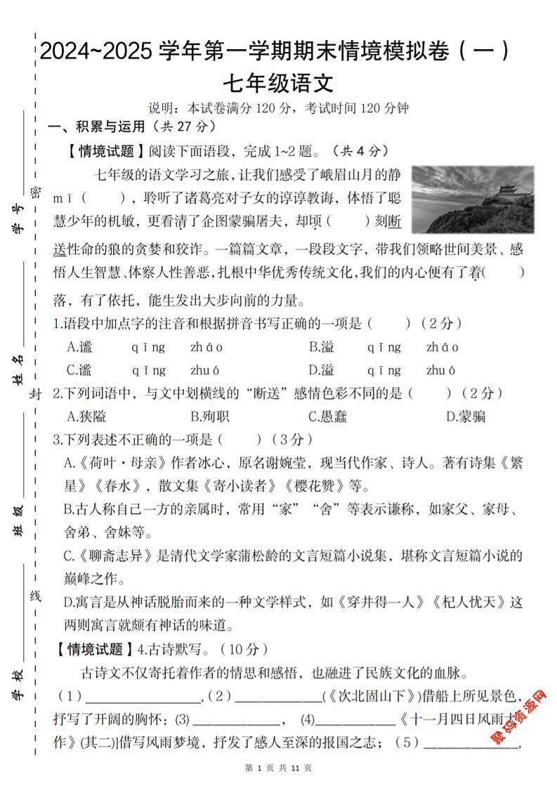 聚码网 七年级 七年级上语文第一学期语文期末情境模拟卷(一) http://www.appstore168.com/93227.html