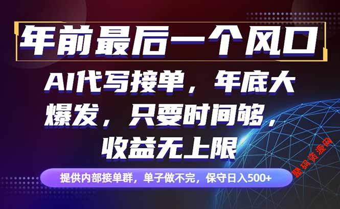 年前最后一个风口项目,跟上就吃肉,只要你有时间,收益无上限,小单几十一两百,大单几百上千,极力推荐大家去做一做,如果你想找一个长久稳定的副业项目,代写是你的首选!市面上很多挂机项目都是幌子,要相信一分耕耘一分收获,你尽管努力,结局不会陪你演戏!这个代写项目也是我们内部是自己在做的一个暴利项目,今天免费给大家分享出来,2025年最新AI代写接单,操作简单容易上手,单日轻松500+,经常听我课程的小伙伴都知道我们团队做网创变现这块绝对是独一档的,我们团队分享的课程是非常非常详细的,课程全程都是干货,细节拉满,最关键的是目前市面上没有人免费教学,收费基本都是3000+,所以现在做的人并不是很多。与此同时我们还解决了AI代写的三大痛点,第一就是大家完全不用担心学不会问题,我们团队有专业的指导老师负责教学,不定期进行腾讯会议解决学员在实操中的各种问题,另外持续免费更新最新指令,第二就是对新手小白特别友好,无需任何复杂操作,学会之后一单就是几分钟的事情,第三就是解决了平台接单的问题,我们提供接单渠道,也会教接单方法高客单价单子,接到你手软,只要有时间多少单都有,而且短时间内就可以见到收益,按照我们团队测试的方法,正常一单一结当天见收益,慢一点的也有周结和月结,这个比较自由。趁现在知道的人还不是很多,小伙伴们赶快去实操!我也期待大家的好消息! 课程目录 01项目介绍 02项目实操 04 变现方式