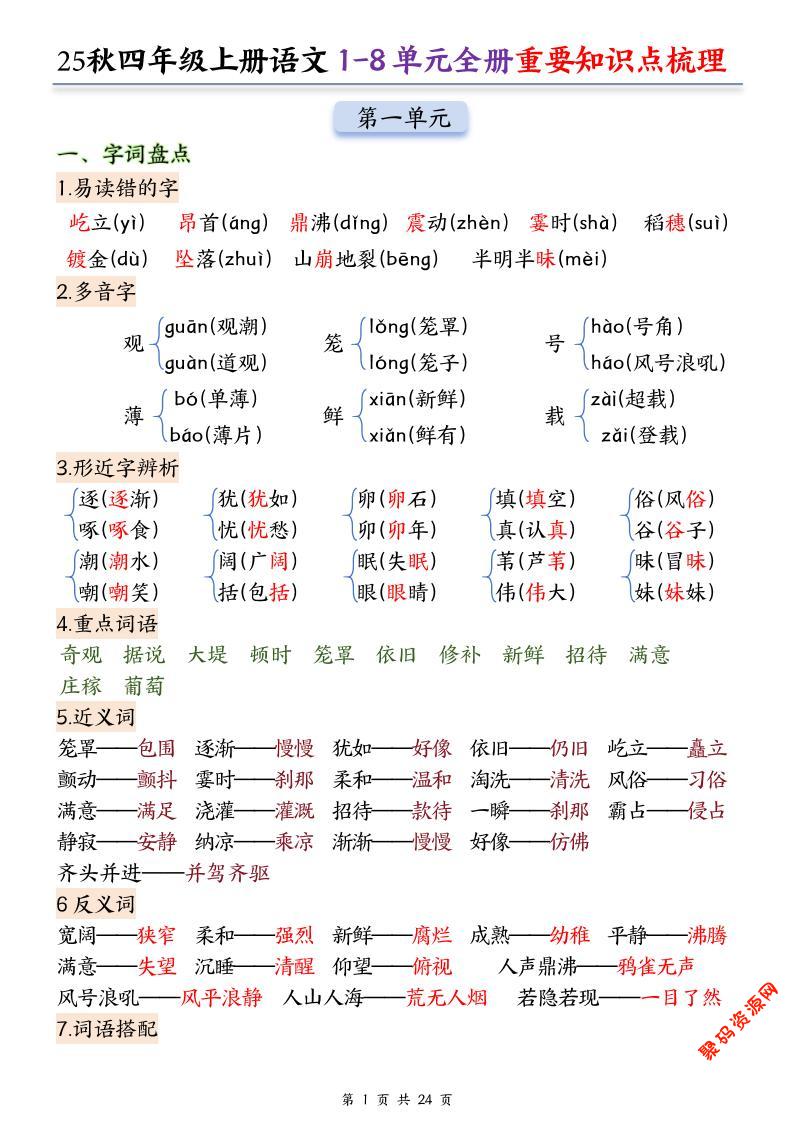 聚码网 四年级 25秋四上语文1-8单元全册重要知识点梳理(24页) http://www.appstore168.com/95208.html
